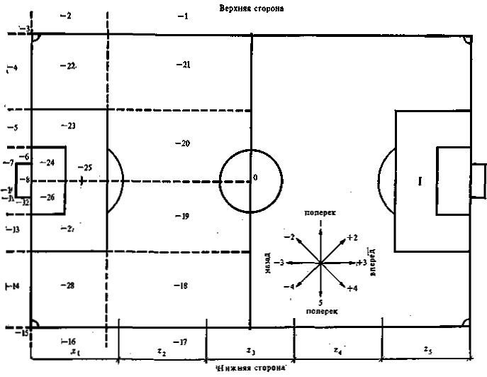 кодом «off» применяемого алгоритма, что означает перерыв (остановку) в игре. Все моменты «off» определялись в зависимости от местоположения игроков. Были зафиксированы все изменения в игре, связанные с выходом мяча за пределы поля (за исключением случаев, когда мяч попадал в перекладину и в стойки ворот. Сегменты 7, 9 и 11). Сегменты 18 — 28 показывают положение игроков и их действия в границах поля. Направление развития игры записывается кодовыми знаками z1-5. Пример: «1 поперек вверх», «2 диагональ вверх» и т. д. Положительным ( + ) и отрицательным ( – ) знаками в алгоритме обозначается развитие игры — вперед или назад, атака или оборона. При пасах с отрицательным знаком не различают диагональные или поперечные пасы (считают, что пас не выполнен по замыслу). В этих случаях просто обозначали «пас назад». Кроме того, все пасы дифференцировали на короткие (до 10 м) и длинные (более 10 м). При анализе игры и оценке специфических действий футболистов видеозапись имела определенные ограничения, связанные с тем, что видеокамера, «сопровождая» мяч, фиксировала не общий план поля, а лишь часть его. В связи с этим, естественно, определенная доля информации терялась. Кроме того, возможности телевидения не позволяют с высокой степенью достоверности передать все технические и тактические тонкости индивидуальной игры и кол- |
