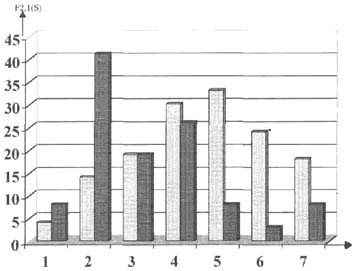 Через 7-10 дней повторить испытание. Чем разумнее будет образ жизни, тем быстрее придет успех. Каждый атлет один раз в неделю показывает тренеру график с показателями. Его нужно сравнивать с идеальным графиком (идеал - 10 нулей подряд). По графику следить за состоянием спортсмена, при этом, если: 1. Если на графике получалась "стиральная доска" (хаотично расположенные ошибки, равные 30-100 см.). Вывод: у спортсмена хроническое состояние утомления (переутомление). 2. После снятия утомления "стиральная доска" осталась. Вывод: в координации движений атлета средние изъяны, необходимы специальные тренировки. 3. Ошибка, не превышающая ±15 см., свидетельствует об оптимальности нагрузки, даже если спортсмен при этом испытывает усталость. Используя тесты: "Семиметровый измерительный эталон" и "Энергетический тонус атлета" получены результаты, в виде выборки статистических данных относящихся к различным группам молодежи. В общей сложности, в экспериментах принимало участие около 1000 атлетов. Одна группа состояла из юношей - учащихся математических классов. Для этой группы получены в зависимости опосредственных показателей психомоторики, которые выражены графически (гистограммы темного цвета см. Рис.1. Статистическая функция распределения для измерительного эталона и Рис.2. Статистическая функция распределения для энергетического теста). Другая группа исследуемых состояла из молодых атлетов, занимающихся спортом в течение достаточно длительного времени (не менее 1,5 лет). Их данные показаны на рис. 1,2 (гистограммы светлого цвета). Эти графические зависимости получены после обработки показателей психомоторики, полученных экспериментальным путем, методами математической статистики. Интервалы реализации опытных данных для 7-ми метрового измерительного эталона Рис. 5. Статистическая функция распределения для измерительного эталона (графические зависимости получены в результате обработке данных по тесту "7-ми метровый измерительный эталон"): F1(S) - графическая зависимость, свойственная полученным данным, относящимся к математическим (лицейным) классам (темный фон); F2(S) - графическая зависимость, свойственная полученным данным, относящимся к молодым атлетам, постоянно занимающимся спортом (светлый фон). Энергетическая функция распределения Интервалы реализации Функция распределения для энергетического тонуса, относящаяся к математическим классам. Интервалы реализации Рис.6. Функция распределения, относящаяся к молодым атлетам (энергетический тонус) На основании анализа полученных результатов можно утверждать: 1. Что "опосредственные показатели психомоторики", свойственные молодым атлетам, подчиняются нормальному закону распределения случайных чисел, т.е. они достаточно прозрачны, предсказуемы и устойчивы (в отличие от математических классов, там показатели хаотичны и непредсказуемы). 2. В целом психомоторика существенно влияет на деятельность индивидуума; более того "сиюминутные" показатели психомоторики (имеющиеся в момент выполнения действия, или в момент принятия решения) могут значительно предопределить успех или неудачу важного предприятия. 3. Опыт показывает, что психомоторные качества подлежат изменению (по крайней мере "оттачиваются") в процессе тренировок и занятий. Распространенные (общепринятые) в настоящее время тесты по о