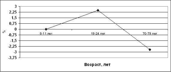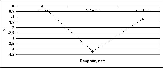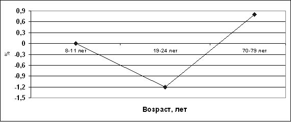 В группе испытуемых 19 - 24 лет в состоянии изотонического напряжения он был значительно ниже, чем в группе испытуемых 8 - 11 лет. Это объясняется, по-видимому, тем, что к этому возрасту у человека в норме обычно заканчивается формирование основных взаимно подвижных масс тела. Такое положение приводит все его биозвенья в более устойчивое равновесие относительно опоры, что снижает нагрузку на антигравитационную мускулатуру. В проведенных опытах было обнаружено также, что у пожилых людей в таких же условиях тонус исследуемых мышц значительно повышается, что свидетельствует о перенапряжении мышц голени, компенсирующих у этих лиц нарушения равновесия, вызванное, по-видимому, различными возрастными отклонениями в состоянии здоровья, приводящими к нарушению осанки (Рис. 1, А). В состоянии изометрического напряжения тонус исследуемых мышц выше всего в группе испытуемых 19 - 24 года, ниже всего у испытуемых 70 - 79 лет. Это свидетельствует о функциональных возможностях и двигательных ресурсах каждой возрастной группы испытуемых и о их возможностях по управлению равновесием своего тела в пространстве (Рис. 1, В). Аналогичные данные подтверждаются также результатами измерения тонуса исследуемых мышц в состоянии их максимального расслабления (Рис. 1, С).
