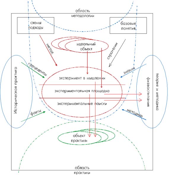 Рис. 1. Системно деятельностное представление организации межпредметной коммуникации Однако, для организации экспериментальной деятельности, предъявления объединяющей схемы "конфигуратора" было недостаточно. В первую очередь схему следовало проблематизировать как возможную "модель" организации новой практики и, используя ее, обсудить различные последствия действий. Действуя таким образом, мы тем самым осуществляли "эксперимент в мышлении", предшествующий реальной экспериментальной деятельности. Несмотря на объективные основания разработанных схем, практики оставляли за собой право самостоятельных инициативных действий в рамках общей программы эксперимента. Реализация программы предполагала широкое использование "опытничества", инициативного экспериментирования, которым сознательно или невольно, занимается каждый творческий педагог. Развертывать сеть экспериментов в масштабах всего региона (гмины) было недопустимо. Дело было не только в сложности управления системой экспериментальной деятельности. При проведении инновации, существенно влияющей на положение дел на местах, возникают как позитивные, так и негативные последствия. Стремясь уменьшить деструктивное воздействие нововведений, реализация программы осуществлялась на "экспериментальной площадке". В специально подобранных школах, новая деятельность была обеспечена изменением существующих норм и снятием ряда стандартных ограничений. Здесь организатору новой деятельности предстояло опуститься на уровень профессиональной методологии физического воспитания. Он должен был обосновать предлагаемые методики с точки зрения их соответствия исторической практики (исторического опыта деятельности локальных и региональных систем физического воспитания) и традиционной методики физического воспитания. Только после проверки реализуемости и эффективности программы в условиях эксперимента стало возможным ответственное изменение региональной практики в предусмотренном заказом направлении. *** Во втором случае автору пришлось иметь дело с созданием уникальной школьной системы ФВ - "фитнесса" (ФВ - "Ф"). При разработке программы ФВ для Киевского лицея бизнеса проектировщики педагогической деятельности не могли использовать профессиональный подход к построению новой методики. В практике не существовали, или не были известны технологии обеспечения психо - физической готовности школьников. В данном случае проектируемый объект (методика) не мог создаваться за счет использования прототипов, прецедентов, или критического переосмысления профессионального опыта. Разрабатывать базовые понятия ФВ - "Ф" пришлось "сверху", используя как философские представления о телесности, духовности, энергетизме и воле, так и праксеологические различения понятий подготовки, компетентности и готовности. Сложность заключалась в том, что спроектированные теоретиком - методологом схемы должен был адекватно понять методист образования, одобряющий, или запрещающий кардинальные изменения в содержании предметов госстандарта. Кроме того, принципиальную структуру и содержание ФВ - "Ф" должен был одобрить руководитель школы. Для решения таких не - простых задач приходится разрабатывать соответствующие орг - деятельностные схемы. Кроме того, как и в первом случае, новое рабоче