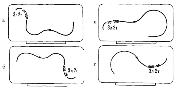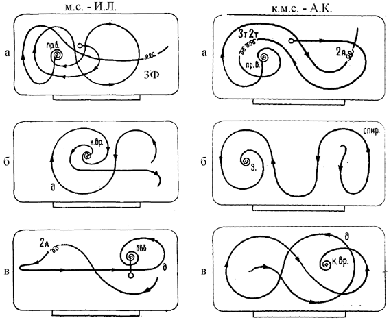 В соответствии с требованиями Международного союза конькобежцев, которые исходят из логики восприятия короткой программы как спортивного зрелища, могут быть сформулированы определенные правила расположения элементов. Сущность требований ИСУ заключается в том, что основная задача программы - демонстрация мастерства в исполнении всех основных групп элементов, поэтому необходимо выбрать такое расположение предписанных элементов на ледяной арене, которое позволило бы наиболее ярко представить уровень владения спортсменом каждым из элементов. Успешное решение этой задачи во многом предопределяет оценку как за технику, так и за артистичность исполнения. Короткая программа включает в себя три элемента вращательного характера: вращение со сменой ног и позиций (для мужчин) и заклон (для женщин), комбинированное вращение и прыжок во вращение. Для того чтобы программа выглядела более сбалансированной целесообразно располагать вращения не далее, чем центральная продольная ось катка рядом с синими и красной линиями, как показано на рис. 3. Финальное вращение лучше исполнять в центре, а два предыдущих - на синих линиях. Непродуманный выбор мест вращений часто создает впечатление, что вращения исполняются в одной части катка, а прыжки - в другой. Кроме того, размещение вращений в углах и противоположного от судей борта "снижает" значимость этих элементов, ухудшает их восприятие, особенно - фигуристов небольшого роста. Рис. 3. Общая схема ледового поля. Короткая программа включает также три прыжковых элемента: каскад, аксель в 2 или 3 оборота, прыжок, выполняемый после комбинации шагов: в три или четыре оборота для мужчин, в два или три оборота - для женщин. При расположении прыжковых элементов в программе, в первую очередь следует учитывать индивидуальные особенности фигуристов, их техническое мастерство, функциональные возможности. На рис. 4 показаны варианты расположения каскада в короткой программе. Задача составления программ связана с другими задачами, стоящими перед тренером и спортсменом в ходе тренировочного процесса. Успешное составление программы может быть достигнуто лишь на основе высокого уровня базовых показателей, определяющих мастерство фигу- Рис. 4. Расположение вариантов