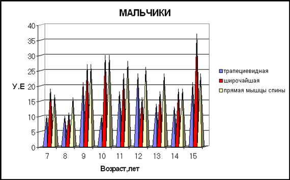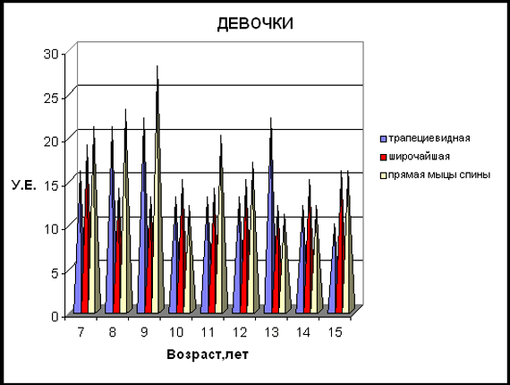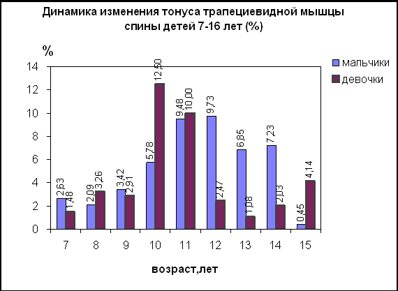 Для регистрации показателей, характеризующих твёрдость мышц использовался механический пружинный миотонометр Сирмаи. Принцип действия его основан на глубине погружения металлического стержня в мышечную ткань: чем мягче ткань, тем больше глубина погружения. Что находит отражение на шкале прибора. Его возможности позволяют получить срочную информацию о состоянии исследуемых мышц. Наибольший интерес представляют не абсолютные данные, касающиеся тонуса мышц в покое, а соотношение показателей тонуса напряженной и расслабленной мышцы, так как это характеризует сократительную способность мышцы. В ходе эксперимента у каждого испытуемого обследовалось три мышцы: трапециевидная, широчайшая и мышца разгибатель спины. Регистрация количественных показателей, объективно отражающих величину твердости проводилась в состояниях изотонического напряжения и покоя. Результаты исследования При исследовании биомеханических свойств мышц детей 7-15 лет наблюдалась сложная динамика изменения тонуса исследуемых мышц, как у мальчиков, так и у девочек (рис. 1). Для анализа динамики формирования тонуса изучаемых мышц у детей различных возрастных групп, определялся прирост показателя твердости исследуемой мышцы в процентном отношении относительно субъектов предыдущего возраста. Но, наибольший интерес представляют данные, характеризующие соотношение показателей твердости напряженной и расслабленной мышцы, так как эти показатели характеризуют сократительную способность мышцы. Чем больше интервал между показателями твердости мышцы, находящейся в состоянии напряжения, и показателями тонуса мышцы в состоянии расслабления, тем больше ее способность к расслаблению и напряжению, и в связи с этим, выше ее сократительная способность. Интересно отметить, что показатели характеризующие сократительную способность исследуемых мышц весьма индивидуальны. Изучая соотношение показателей тонуса напряженной и расслабленной мышцы были получены следующие результаты и установлено, что изменения сократительной способности изучаемых мышц носит волнообразный характер, как у мальчиков, так и у девочек. В возрасте от 7 до 8 лет среднее значение показателя сократительной способности трапециевидной мышцы у мальчиков составило 10 у.е. (разница между показателями твердости мышцы, находящейся в состоянии напряжения, и расслабления), с 8 до 9 лет этот показатель увеличивается до 21 у.е., А в 12 лет наблюдается максимальное увеличение показателя сократительной способности трапециевидной мышцы - 24 у.е., после чего происходит постепенное снижение. У девочек наблюдается два пика максимального увеличения сократительной способности трапециевидной мышцы равной 22 у.е: первый -зарегистрирован в период с 8 до 9 лет, а следующий в 13 лет. Затем, как и у мальчиков происходит постепенное снижение показателей до минимального значения и в 15 лет он составляет 10 у.е. (Рис.2.). Анализ твердости широчайшей показал, что у мальчиков с 8 до 10 лет наблюдается значительный прирост исследуемого показателя с 11 до 30 у.е. , а наибольшее его значение зарегистрировано в 15 лет, что составляет 37 у.е. В период с 10 до 14 лет изучаемый показатель находится в пределах от 19 до 24 у.е. Минимальное значение, сократительной способности исследуемой мышцы зарегистрировано в 8 лет и составляет 11 у.е. Анализируя к