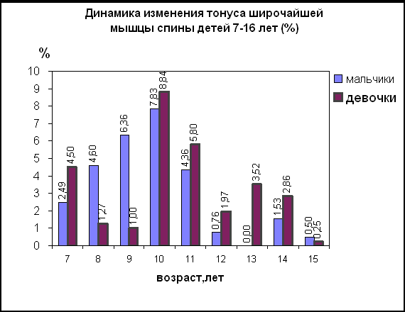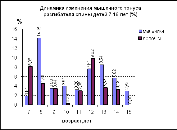 Рис. 1 Динамика изменения тонуса трапециевидной мышцы, широчайшей мышцы спины и разгибателя спины детей 7-16 лет (%) Рис. 2. Упруго-вязкие свойства скелетных мышц мальчиков и девочек 7 - 15 лет Литература