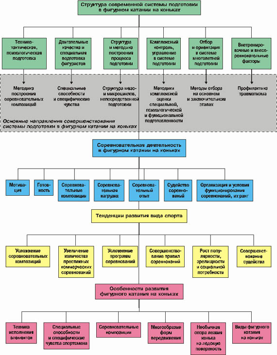 СТРУКТУРА И ОСНОВНЫЕ НАПРАВЛЕНИЯ СОВЕРШЕНСТВОВАНИЯ СОВРЕМЕННОЙ СИСТЕМЫ ПОДГОТОВКИ КВАЛИФИЦИРОВАННЫХ ФИГУРИСТОВ Ирина Медведева Национальный университет физического воспитания и спорта Украины Аннотация. В данной статье представлена структура современной системы подготовки квалифицированных спортсменов в фигурном катании на коньках и основные направления ее совершенствования. Ключевые слова: соревновательная композиция, структура, специальные способности, направлении. Анотацiя. Медведева I.М. Структура i основнi напрямки вдосконалення сучасноi системи пiдготовки квалiфiкованих фiгуристiв. У данiй статтi представленi структура сучасноi пiдготовки квалiфiкованих спортсменiв у фiгурному катаннi на ковзанах та основнi напрямки ii вдосконалення. Ключовi слова: змагальнi композицii, структура, спецiальнi здiбностi, напрямки. Annotation. Medvedeva I.M. Frame and basic directions of perfecting of modern. In given article the structure of present system of preparation of the qualified sportsmen in figure skating on ice and the basic directions of it’s perfection is submitted. Key words: a competitive composition, structure, specialized capacities, directions. Проблема - значительные изменения, произошедшие в фигурном катании на коньках за последние годы, а именно: повышение популярности и зрелищности вида спорта, рост престижных коммерческих соревнований, совершенствование их правил и соответствующие нововведения в программу крупных международных соревнований, усложнение соревновательных композиций, требуют адекватной коррекции в системе подготовки квалифицированных фигуристов. Целью исследований является обоснование структуры современной системы подготовки квалифицированных фигуристов с учетом специфики вида спорта и определение основных направлений ее совершенствования. Проведенный корреляционный анализ позволил установить внутренние связи сильной и средней степени между различными звеньями рассматриваемых подсистем. Данные взаимосвязи определены на основании изучения особенностей и тенденций развития фигурного катания на коньках и его соревновательной деятельности, предопределяющей структуру и содержание системы подготовки в виде спорта. Учитывая, количество и степень установленных взаимосвязей, рассматриваемые звенья были распределены по значимости, обусловливающим их показателям и характерным признакам. В первой подсистеме, касающейся содержания видов подготовки фигуристов, рассматриваются основы спортивной техники, проблемы психологической подготовленности, особенности тактической подготовки фигуристов. Наиболее важным и актуальным направлением для практики спорта в этой подсистеме является построение и совершенствование соревновательных композиций, которые в первую очередь, обуславливают готовность фигуриста к соревнованиям. Корреляционная связь данных показателей (4 и 6 звено) составляет (r = 0,511; r = 0,444). В следующей подсистеме, включающей в себя виды различных двигательных качеств - скоростных возможностей, гибкости, силы, координации, выносливости - и показатели, определяющие уровень их развития, для фигуристов высокой квалификации первостепенное значение имеет совершенствование специальных способностей и специфических чувств. Особенностью двигательной деятельности фигуристов являются специфические виды восприятия: чувство льда, чувство времени и пространства, чувство партнера. В их основе лежат мышечные, зрительные, слухов