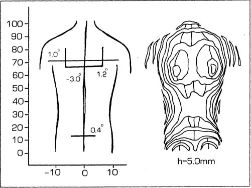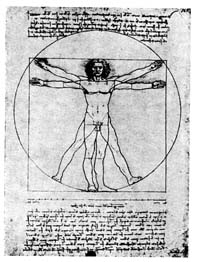 В эпоху Возрождения внес много нового в учение о пропорциях тела человека великий Леонардо да Винчи. За модуль Леонардо да Винчи брал высоту головы, которая 8 раз укладывалась в росте тела человека (рис. 2). Многие измерения пространственного расположения биозвеньев тела проводились исследователями на трупах. Для изучения параметров сегментов тела человека, за последние сто лет было рассечено около 50 трупов. В этих исследованиях трупы замораживались, рассекались по осям вращения в суставах, после чего сегменты взвешивались, определялись положения центров масс (ЦМ) звеньев и их моменты инерции преимущественно с использованием известного метода физического маятника. Кроме этого определялись объемы и средние плотности тканей сегментов. Исследования в таком направлении проводились также и на живых людях. В настоящее время для прижизненного определения геометрии масс тела человека используются ряд методов: метод водного погружения; метод фотограмметрии; метод, так называемого, внезапного освобождения; метод взвешивания тела человека в различных изменяющихся позах; метод механических колебаний; радиоизотопный метод; метод физического моделирования; метод математического моделирования [4]. Исследования последних [1, 4, 5] лет указывают на то, что осанку, возможно, оценивать по геометрии масс тела человека, так как одной из причин ее нарушений является возникновение чрезмерно большого опрокидывающего момента относительно одной или двух плоскостей пространства, занимаемого телом человека. Это вызывает излишнее перенапряжение мышц-разгибателей и деформацию продольной оси позвоночного столба. Нарушение осанки, в дошкольном и школьном возрасте приводит к ухудшению работы органов и систем растущего организма. Нарушение осанки у детей встречается как в сагиттальной, так и во фронтальной плоскостях. В сагиттальной плоскости различают нарушение осанки с увеличением или уменьшением физиологических изгибов позвоночного столба. Круглая спина (сутулость) - это наиболее часто встречающееся отклонение, при котором наблюдается сильно выраженный грудной кифоз (который захватывает часть поясничного отдела позвоночного столба) и значительное уменьшение поясничного лордоза. При круглой спине голова обычно наклонена вперед; грудная клетка уплощена; плечи опущены вперед; лопатки имеют крыловидную форму; спина округлая; живот выпячен или отвисает; ягодицы уплощены; колени полусогнуты. Мышцы туловища в таком положении ослаблены, поэтому принять правильную осанку можно лишь на короткое время. При кругло-вогнутой спине значительно выражен грудной кифоз и поясничный лордоз; увеличен угол наклона таза; ягодицы резко выпячены назад, живот выпячен; талия укорочена; голова, шея и плечи наклонены вперед; грудная клетка уплощена. Наблюдается недоразвитие мышц брюшного пресса, что обусловливает опускание внутренних органов. Плоская спина характеризуется сглаженностью физиологических изгибов позвоночного столба; лопатки имеют крыловидную форму (внутренние края и нижние углы лопаток расходятся в стороны). Грудная клетка недостаточно выпуклая, смещена вперед; нижняя часть живота выдается вперед. Определив у ребенка данный тип нарушения осанки, необходимо обязательно осмотреть его спину в горизонтальной плоскости (проба с наклоном впе
