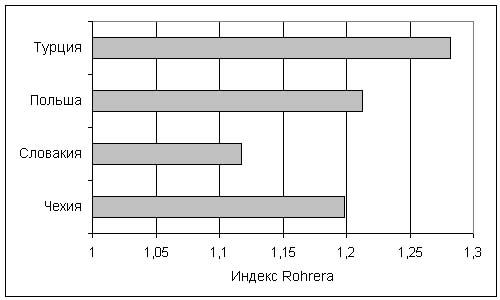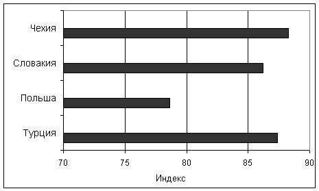 В результате проведенного корреляционного анализа определены взаимосвязи между исследуемыми показателями, которые могут влиять на результат турнира, а также спортивный результат (место в списке ITF). Из 16 коэффициентов корреляций с занятым местом в Чемпионате Европы 5 имеют высокую степень корреляции, 9-среднюю и 4 низкую. Высокий уровень связей обнаружен с: местом в списке ITF (r=0,816); диаметром предплечья (0,785); толщиной 3 кожно-жировых складок (0,763); стажем тренировки (-0,71) и возрастом начала занятий спортом (0,68). Из связей места в списке ITF с исследованными показателями - 3 имеют высокий уровень, 9-средний и 3-низкий. Высокий уровень связей обнаружен с: занятым местом в Чемпионате Eвропы (r=0,8), шириной таза (r=0,7), а также диаметром предплечья (r=0,7). Учитывая пропорции верхней частей тела, спортсменки представляют разную степень полового диморфизма. На основе средней величины показателей тазо-плечевого индекса можно [1] считать, что сборные Чехии, Словакии и Турции имеют более "женское" строение тела, а Польши - более мужское (рис. 1). Рис. 1. Тазо-плечевые пропорции теннисисток принимающих участие в Чемпионате Европы (Gdynia-2002). Средние значения индекса Rohrera сборных команд по теннису, участвующих в Чемпионате Европы, представлены на рис. 2. Учитывая классификацию соматотипов по E.Kretschmera [3] можно считать, что сборные команды Чехии, Словакии и Польши находятся в диапазоне характерном для типа лептосоматического строения тела. Сборная Турции - отчетливо находится в диапазоне атлетического строения. Рис. 2.Степень эктоморфии (по индексу Rohrera) теннисисток принимающих участие в Чемпионате Европы (Gdynia-2002). ДИСКУССИЯ В настоящее время чрезвычайно сложно однозначно определить роль соматических показателей в эффективной соревновательной деятельности в спортивных играх. Практика подготовки лучших теннисисток мира показывает, что высокие спортивные результаты демонстрируют спортсмены с различными типами строения тела. Очевидно, как в большинстве ациклических видов спорта, разнообразие факторов, влияющих на исход игры и победы, являются причиной того, что, в теннисе каждая спортсменка независимо от величин и пропорций тела может формировать собственный стиль игры, основанный на индивидуальных морфологических предпосылках. Такие зависимости подтверждены были в многочисленных исследованиях, особенно в спортивных единоборствах [7, 9, 12]. В связи с этим методически оправданной должна быть необходимость расширения исследуемых корреляций с индивидуальной информацией, касающейся особенностей двигательной деятельности в соревнованиях. Исследования ряда авторов показали, что с увеличением стажа тренировки, а, тем самым, и уровня спортивного мастерства, увеличивается однородность соматотипов в диапазоне конкретного вида спорта [4, 10]. А в связи с большой неоднородностью (V = 7%) спортивного уровня теннисисток (с 1 по 1000 место в классификации ITF), определение такой зависимости в наши исследованиях оказалось невозможном. Обследованные теннисистки, как в средних (для сборной), так и индивидуальных величинах существенно различались по строению тела (V=7%) , а также степени полового деморфизма (V=7,8%). Однако, самая большая неоднородность наблюдается по фактору ожирения - V=33% и только по показателю длины тела теннисистки представляли однородную группу (V=2,3%). Высокая те