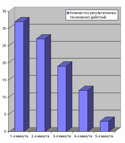 Эффективность применения данных технических действий был соответственно: 61%, 52%, 66% . В результате проведенных наблюдений были выявлены следующие показатели и закономерности структуры техники дзюдо: из 160 попыток, как правило, наблюдается около 93-результативных; наиболее распространенными приемами при этом являются такие как: бросок подхватом, бросок подсадом садясь, бросок через спину, задняя подножка, болевой прием на руку. Все эти приемы в среднем имеют стабильную эффективность более 50%, - что свидетельствует о достаточной возможности эффективного и стабильного выполнения в соревновательной практике. Рис. 2. Гистограмма, характеризующая распределение количества результативных технических действий во временной структуре поединков в дзюдо На рисунке 2 показано распределение результативных технических действий на протяжении поединка. Из него видно, что количество результативных действий с течением времени снижается. Это свидетельствует о досрочном окончании поединков или нарастающем утомлении спортсменов. Полученные данные дают основание утверждать, что вышеупомянутые технические действия являются наиболее используемыми приемами дзюдо. Это также позволяет сделать вывод, что спортсмены, в совершенстве владеющие этими приемами, могут с большой степенью вероятности претендовать на успех в поединках при условии правильного их использования. Высокая степень реализации данных технических действий говорит о том, что они выполняются после предварительной подготовки и во время того, когда спортсмен уверен, что это техническое действие будет эффективно выполнено. Вывод. Результаты анализа проведенных исследований позволяют говорить о необходимости внесения корректив в тренировочный процесс высококвалифицированных дзюдоистов в направлении совершенствования и расширения имеющегося арсенала технических действий, а также оптимизации двигательного состава приемов, используемых спортсменами в ходе соревновательной деятельности. Литература