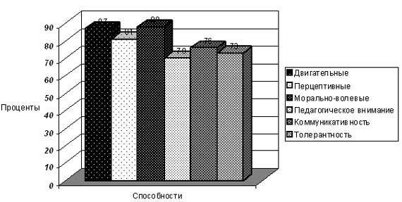 Методика и организация исследований. Для дальнейшего исследования и определения уровня развития профессионально важных качеств будущих учителей физической культуры, была разработана комплексная программа, в которую вошли следующие методы исследований: теоретический анализ, наблюдение, анкетирование, тестирование, методы математической статистики. В качестве ведущих характеристик готовности выпускника к профессиональной деятельности, были определены не только теоретические знания и интеллектуальные способности, специальные умения и навыки, но и собственное мировоззрение, личные качества, мотивационно-ценностные ориентации, физическое развитие, проявление активности в области физической культуры, особенности поведения. С целью объективной оценки формирования педагогических способностей, личных качеств, специальных навыков и умений будущих учителей физической культуры, было проведено исследование в три этапа. На первом этапе была разработана анкета педагогических способностей учителя физической культуры, в которую вошли: коммуникативные, суггестивные, организационные, дидактические, речевые, перцептивные, конструктивные способности, педагогическая наблюдательность и внима-тельность, креативность, толерантность, двигательные и личностные качества. На втором этапе, педагогическую деятельность практикантов оценивали учителя физической культуры тех школ, где проходила педагогическая практика по следующим критериям: подготовленность к уроку, проведение урока, коммуникативные и организационные способности, культура речи (в том числе умение подавать команды, знание терминологии) и двигательная активность будущего учителя (демонстрация техники движений, особенности моторики). На заключительном этапе, студенты при заполнении анкеты давали самооценку собственной профессиональной подготовленности. Оценивание проходило по двенадцати бальной системе: высокие показатели (9-12 баллов), средние показатели (5-8 баллов), низкие - (1-4 балла). Результаты исследований. Анализ анкетирования 69 выпускников факультета физического воспитания показал, что большинство студентов важными для педагога способностями считают такие: справедливость, ответственность, требовательность к себе и детям (95%), любовь и уважение к детям (91%), перцептивные способности (умение воспринимать другого человека и понимать его), работоспособность и двигательные качества (87%). Важное место также занимают такие черты, как культура поведения и внешний вид, личные качества (82%), коммуникативность (76%), толерантность (чувствительность к человеку, способность сопереживать ученику, 73%), педагогическая наблюдательность и педагогическая внимательность (70%), культура речи, педагогический такт и умение проникать в мир детей (57%) (рис. 1). Рис.1. Профессионально-значимые способности учителя физической культуры (по данным анкетирования выпускников факультета физического воспитания) Второстепенными компонентами в формировании личности педагога, выпускники считают: эмоциональную стабильность (умение владеть собой, 48%), организационные умения (46%), дидактические способности (умение излагать учебный материал доступно и понятно, 44%) и креативность (способность к творчеству, 35%). Эти показатели свидетельствуют о том, что студенты-выпускники находятся на минимально