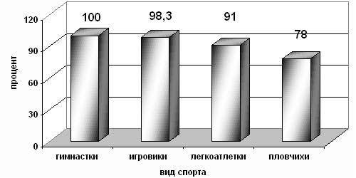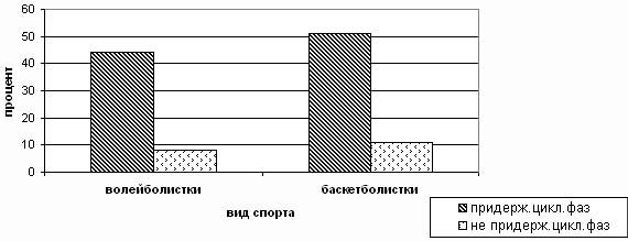 В результате исследования было выявлено, что во всех периодах тренировочного процесса ни тренерами, ни медицинскими работниками не проводится учет фаз менструального цикла спортсменок. И как следствие, в 80% случаев наблюдаются нарушения менструального цикла. Результаты анкетирования спортсменок высокой квалификации показали, что большее число нарушений менструальной функции наблюдаются у девушек, которые не снижают тренировочную нагрузку в фазы физиологического напряжения (менструальную, овуляторную и предменструальную). В 100% случаев в менструальную фазу тренируются гимнастки, в 98.3% - женщины игровых видов спорта и тяжелой атлетики, в 91% - женщины, занимающиеся легкой атлетикой [3] (рис.1). Кроме того, было отмечено, что у 85% спортсменок работоспособность и общее соматическое состояние в период предменструальной и менструальной фаз цикла значительно снижены из-за резкого физиологического спада половых гормонов, у 4 % - без изменения, у 11% - повышение функционального состояния. Рис. 1. Количество (% от числа опрошенных) спортсменок, которые тренируются в менструальную фазу циклических и ациклических видов спорта. Значит, микроциклы, в которые входят предменструальная и менструальная фазы являются непродуктивными и требуют особого подхода в их организации [2,5]. Нами был предложен метод совершенствования тренировочного процесса путем применения сдвоенных недельных микроциклов с воздействием максимальных нагрузок в постменструальную и постовулярную фазы цикла спортсменки. Для этого необходимо знать продолжительность менструального цикла каждой спортсменки, дни овуляции, регулярность цикла. Данный метод основан на биологической особенности женского организма - цикличности функций всех его систем согласно двум основным фазам менструального цикла - фолликулиновой - с 1 -14 день и лютеиновой - с 15 - 28 день менструального цикла [2,4]. Каждой спортсменке составлялись выходные таблицы по месяцам и дням, по которым получали исходную информацию в целом на весь тренировочный период. При нарушении указанных принципов, у спортсменок тренировочный процесс будет идти по мужскому типу, где исключается возможность использования внутреннего резерва организма, в целях ускорения восстановительных процессов, улучшения переносимости больших физических и психоэмоциональных нагрузок, как следствие, успешного участия в соревнованиях. Обучению данной модели тренировочного месячного цикла прошли практически все спортсменки, состоящие на "Д" - учете в областном центре спортивной медицины. В результате анкетирования выявлено, что среди исследуемой группы, вышеизложенной программы придерживаются 45 - 50% спортсменок, 50 % - тренируются согласно тренировочного плана. Нами было выявлено, что именно те спортсменки, которые не придерживаются принципов цикличности физических нагрузок, имеют наибольший процент нарушений менструального цикла (рис.2). Реализация предложенной программы может быть смело применена на практике при построении учебно- тренировочного процесса для юных спортсменок при переходе во взрослые группы. Известно, что основной удар тренировочных воздействий приходится на период полового созревания и становления менструальной функции [6]. В видах спорта, с ранней специализацией, большие физические и психологические нагрузки сов