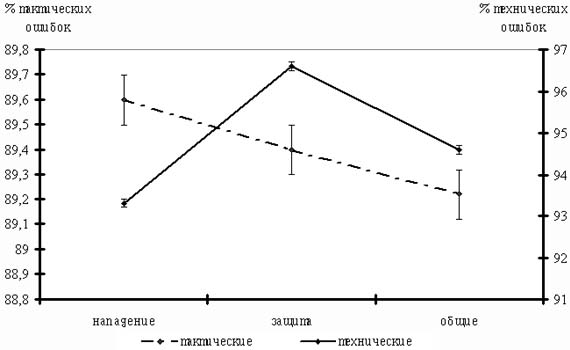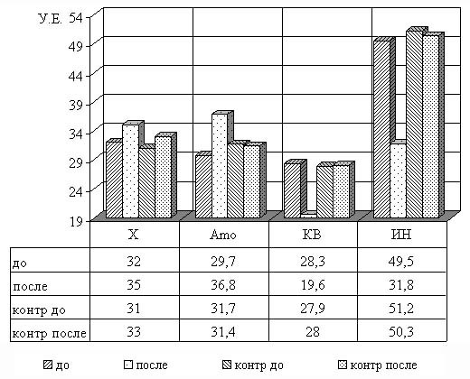 Достоверное понижение указанного показателя регуляции ритма сердца свидетельствует о значительном уменьшении влияния гуморального канала (автономного контура) регуляции на ритм сердца. При пролонгированном воздействии ЭМЛ мы наблюдали снижение ЧСС в покое 67,2±1,2 (73,1±2,1 контроль) мы интерпретируем это как фактор расширения адаптивных возможностях организма. Индекс напряжения (ИН) Р.М.Баевского статистически достоверен и до, и после воздействия ЭМЛ (рис.1). Эти изменения свидетельствуют об уменьшении напряжения центральных регуляторных механизмов регуляции ритма сердца. Уменьшение величины ИН указывает на повышение адаптации, спортсменов к тренировочным нагрузкам [8]. Рис 1. Влияние пролонгированного воздействия ЭМЛ на показатели кардиоритма у баскетболистов. Из других показателей в результате анализа можно выделить тенденцию к уменьшению коэффициента вариации, степени дыхательной аритмии и асимметрии. Несмотря на их малую среднегрупповую информативность полученные показатели могут быть использованы при индивидуальном анализе данных. Проведенные исследования показали, что у спортсменов экспериментальной группы на фоне пролонгированного воздействия ЭМЛ наблюдается тенденция к улучшению соревновательной деятельности (табл.2) по сравнению с исходным состоянием показателей выносливости, силы и быстроты перемещения на площадке. Так, эффективность бросков с ближних и средних дистанций возросла с 46,4% до 48,5%; штрафных бросков с 68,6% до 74,2%. Таблица 2 Соотношение тактических и технических ошибок, совершаемых баскетболистами в среднем за игру ( n = 22 ).