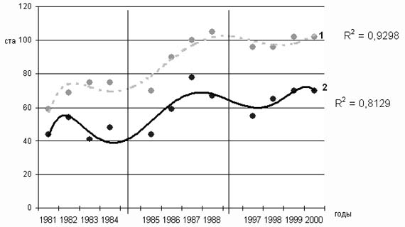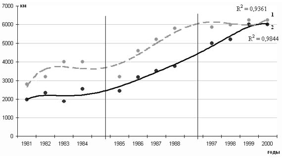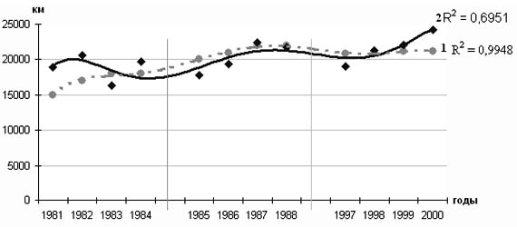Рис. 1. Динамика плановых и фактических параметров общего объема специальной подготовки велосипедисток в олимпийских циклах: 1 - плановые показатели, 2 - фактические показатели, R2 - величина достоверности аппроксимации Рис.2. Динамика плановых и фактических параметров объема соревновательной нагрузки велосипедисток в олимпийских циклах: 1-плановые показатели, 2 - фактические показатели, R2- величина достоверности аппроксимации Рис. 3. Динамика плановых и фактических показателей количества стартов велосипедисток в олимпийских циклах: 1- плановые показатели , 2 - фактические показатели, R2 - величина достоверности аппроксимации Рассмотрев изменения объема соревновательной нагрузки, следует отметить что, от цикла к циклу также имеется тенденция увеличения, от 8491±77км в первом, до 12739±748 км во втором и до 22200 км в третьем цикле (табл. 4). В процентном выражении это выглядит так: во втором цикле по сравнению с первым увеличение на 50%, и в третьем цикле, по сравнению с первым на 160%. Сравнивая показатели второго цикла с третьим циклом отмечается увеличение на 74%. Согласно полученным данным количество стартов изменялось так, за первый цикл - 185±2, за второй цикл 251±5 и за третий - 264 (рис.3). Отмечается увеличение во втором цикле по сравнению с первым на 36%, при сравнении третьего цикла с первым на 43%. При сравнении количества стартов за весь олимпийский цикл 1997-2000 гг. с олимпийским циклом 1985-1988 гг. обнаруживаем изменение всего на 5%. Весьма важным на наш взгляд является то, что объем соревновательной нагрузки увеличивался весьма существенно, а количество стартов не столь значительно (рис. 2, 3). Это связано с тем, что протяженность дистанции групповой гонки изменилась от 60-70 км в начале 80-годов до 119 км в 2000 году. Выводы. 1. Общий объем специальной подготовки у велосипедисток-шоссейниц достигает своего максимума, и этот фактор повышения подготовленности исчерпывает себя. 2. Одним из важнейших резервов совершенствования системы подготовки высококвалифицированных спортсменок является увеличение объемов соревновательной деятельности и рационального распределения стартов в годичных и четырехлетних циклах. 3. Анализ динамики результатов и показателей нагрузок показал, что украинские велосипедистки-шоссейницы по итогам участия в Играх Олимпиад за двадцатилетний период занимают 10-11 место и как видно из представленных данных одним из факторов роста спортивных достижений украинских гонщиц является увеличение количества стартов и объема соревновательных нагрузок. В современной спортивной тренировке высококвалифицированных спортсменов исследования не ограничиваются анализом динамики спортивных результатов - конечного звена спортивной подготовки. Их анализ несет определенную информационную нагрузку, но все же не позволяет выявить причинно-следственные отношения тренировочного процесса и спортивного результата. Исследования структуры соревновательной деятельности с использованием логического и математического анализов позволят установить значимость отдельных функциональных проявлений и дадут существенную возможность в понимании соревновательной деятельности в женском велосипедном спорте на шоссе. Литература