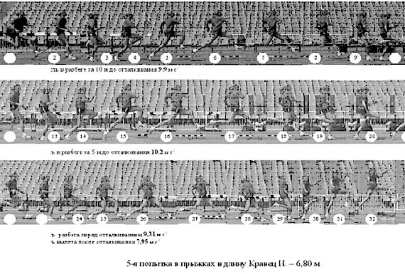 Во второй попытке (спортивный результат 6,40 м) скорость разбега спортсменки за 10 м до отталкивания составила 9,2 м·с-1, за 5 м до отталкивания ее величина возросла до 10,00 м·с-1. Однако скорость разбега спортсменки перед отталкиванием снизилась до 9,20 м·с-1. Спортсменка выполнила разбег с широкой амплитудой и хорошим чувством упругости при контакте с опорой. Перед отталкиванием она излишне подсела на маховой ноге, что привело к потере скорости до 9,20 м·с-1 и повлекло за собой снижение скорости вылета ОЦМ тела в момент отталкивания, которая в данной попытке составляет 8,63 м·с-1 (модельная величина 8,67 м·с-1). Такая значительная потеря скорости явилась причиной снижения спортивного результата. При выполнении отталкивания угол разгибания тазобедренного сустава опорной ноги составил 188,1 град, величина которого превышает модельную (187,24 град). В прыжке на 6,40 м время отталкивания равно 0,12 с (модельная величина 0,11 с. Угловая скорость разгибания коленного сустава опорной ноги спортсменки 4,67 рад·с-1, что значительно меньше модельной (7,28 рад·с-1). Средняя полная энергия движения тела И. Кравец прыжке на 6,40 м - 3,1 кДж, а модельная ниже 2,60 кДж. Величина работы, произведенной спортсменкой при отталкивании равна 86,3 Дж (модельная величина 496,60 Дж). Средняя мощность отталкивания в этой попытке составила (2,9 кВт), что значительно ниже модельной величины (5,08 кВт). В третьей попытке (спортивный результат 6,70 м) скорость разбега спортсменки за 10 м до отталкивания составила 9,0 м·с-1, за 5 м до отталкивания ее величина возросла до 9,9 м·с-1, а перед отталкиванием еще более увеличилась до 10,08 м·с-1. Спортсменка выполнила разбег с широкой амплитудой и хорошим чувством упругости при контакте с опорой. Она постепенно набирала скорость в разбеге и в этой попытке ей удалось проявить ее максимальные показатели перед отталкиванием 10,08 м·с-1. Согласно разработанных нами биомеханических моделей двигательных действий, обеспечивающих достижение заданных спортивных результатов в прыжке в длину на 6,70 м у женщин, скорость разбега перед отталкиванием равна 9,36 м·с-1. Необходимо отметить, что такие высокие показатели скорости разбега перед отталкиванием свидетельствуют о высоком уровне проявления скоростных способностей И. Кравец. На последних беговых шагах произошло некоторое снижение траектории движения ОЦМ тела спортсменки. Наибольшее снижение отмечалось на последних двух шагах разбега и особенно в предпоследнем. В последнем шаге стопа ставилась плоско с внешнего свода. При общем уровне снижения ОЦМ тела сохранялось упругое высокое положение на стопе. Туловище прыгуньи на последних шагах разбега несколько отклонено назад, что мешало эффективному входу в отталкивание. Устремленность к переводу ОЦМ тела вверх приводит прыгунью к пассивному сходу с маховой ноги. Полное выпрямление туловища происходит только при выполнении последнего бегового шага за счет активного выведения таза вперед. Угол разгибания тазобедренного сустава опорной ноги И. Кравец при отталкивании равен 192,0 град и соответствует модельной величине 192,22. Основной задачей отталкивания является создание высокой траектории полета с минимальными потерями горизонтальной скорости, приобретенной в разбеге. Хотя спортсменка и развила высокую скорость перед отталкиванием она значительно потеряла ее в отталкивани