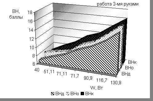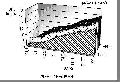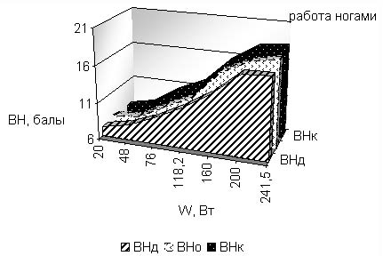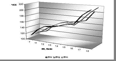 Между ЧСС и субъективно воспринимаемой напряженностью работы ног, дыхания и общей напряженность работы выявленная достоверная положительная высокая взаимосвязь (табл. 2), данные зависимости описываются уравнениями линейной регрессии. Среднее значение ЧСС, которое отвечает субъективно воспринимаемой напряженности работы ног, больше, чем среднее значение ЧСС, которое отвечает воспринимаемой напряженности работы дыхания и несколько больше ЧСС, которая отвечает общей воспринимаемой напряженности. При одинаковой средней оценке воспринимаемой напряженности (13,67 балла) средняя ЧСС соответственно равно 159,15; 156,2 и 159 уд/мин (табл.2). Однако общий характер данных взаимосвязей немного отличается от характера взаимосвязей, полученных в результате лабораторного эксперимента. Соотношение зависимостей ВНк,