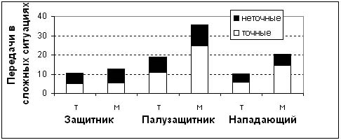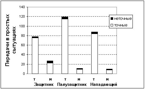 *- верхние величины касаются деятельности игрока во время тренировки, а нижние относятся ко времени матча Он забивал около 5 голов. Эффективность ударов защитника была самой низкой ( 0,8 голов за время одного тренировочного занятия). Анализ исследуемых показателей в процессе игр показал, что в 5 анализируемых матчах полузащитник и нападающий забили по одному голу. Чаще всего бил по воротам нападающий (в среднем два удара в одном матче), полузащитник бил по воротам 1,2 раза с атаки, а защитник ни разу не бил по воротам. Анализируя частоту ударов по воротам, выполненных во время тренировок и матчей, отмечено, что как количество, так и качество ударов были на низком уровне (рис.1). Во время тренировок нападающий выполнял мало ударов, а еще меньше - защитник и полузащитник. Ударами из стандартных положений игры только полузащитник пытался производить удары по воротам противника, как во время тренировок, так и во время ответственных матчей. В течение пяти тренировочных занятий он выполнял 25 ударов (в среднем по 5 ударов за занятия) с 12% эффективностью, а в матчах - только 3 неэффективных удара (в среднем 0,6 удара за матч). Рис. 1. Количество и точность ударов по воротам, выполненных игроками различных игровых позиций во время игры ( Т - тренировка, М - матч) Количественная характеристика, приведенная в таблице 1 и на рис. 2 показывают, что полузащитник подавал мяч чаще всего в простых ситуациях во время тренировок (в среднем 120 раз). Реже всего подавал мяч защитник (около 78 раз). В матчах же это чаще всего делал защитник (в среднем больше 27 раз за время одного матча). Реже всего это делал нападающий (9,6 подач за время одной встречи). Таким образом, обратная зависимость анализируемых показателей использования технико - тактических действий футболистов всех игровых позиций свидетельствует о том, что использование тренировочных средств не соответствует соревновательным условиям. Рис. 2. Количество и эффективность подачи мяча в простых ситуациях (Т - тренировка, М - матч) С данных, приведенных в таблице 1 и рис. 3 следует, что подачу мяча в сложных ситуациях, как во время тренировок, так и во время матчей, чаще всего использовал полузащитник (соответственно 18,8 и 35,6 подач в одном матче). Реже это делал защитник (10,4 и 12,8 подач). Только полузащитники пробовали нетрадиционными сложными подачами прокладывать путь к воротам. При первоначальном анализе видно, что относительно частоты подачи мяча в матчах, число выполняемых во время тренировок подач в тяжелых ситуациях было маленьким. Прежде всего, это касается полузащитника и нападающего. Правильно было бы изменить тренировочный акцент на увеличение числа упражнений, во время которых игрок должен подавать мяч сопернику в прямом контакте. Эти замечания касаются и поединков один на один в атаке (см. рис. 1), несмотря на то, что во время тренировок, как и во время матчей, выигрывал чаще всего нападающий (соответственно - 4,6 и 4,6 раза), а реже всего защитник (2,2 и 1,0). Рис. 3. Частота и