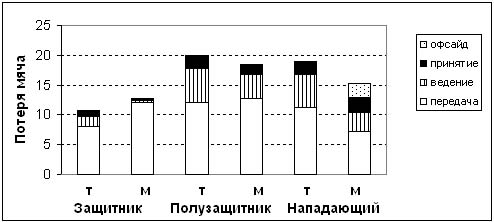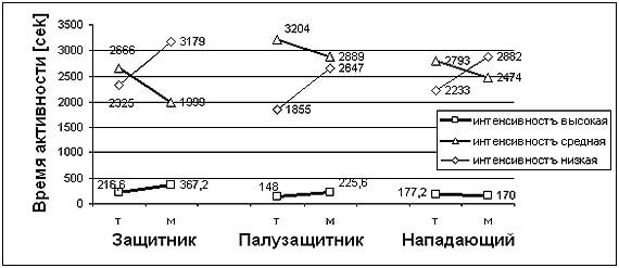 проигранных один на один поединков в защите На рис. 6 представлено сравнение уровней времени активности игроков в тренировочных занятиях и матчах по трем уровням интенсивностей. Время активности высокой интенсивности защитника и полузащитника во время тренировки значительно отличалось от того, которое было во время ответственных встреч. Из рисунка видно, что они на тренировках, в среднем, почти в два раза меньше времени двигались с интенсивностью характерной для матча. Это свидетельствует о неправильной подготовке к требованиям матча. В то же время активность нападающего на тренировках была такой же, как во время матчей. Сравнение двигательной активности исследуемых игроков на уровне средней интенсивности показало большую разницу в структуре активности между тренировочными занятиями и матчами у игроков разных игровых позиций. Прежде всего это касалось защитника. Из рис. 6 также видно, что по уровню низкой интенсивности тренировочные занятия не соответствовали матчам у всех обследованных игроков. Отличия были значительными и могут свидетельствовать о том, что объем тренировок (косвенно характеризируемый длительностью тренировочных занятий) не был адекватным по отношению к уровням интенсивности, требующимся во время матчей. Рис. 6. Сравнение времени активности игроков во время тренировочных занятий и матчей в трех уровнях интенсивности ( Т - тренировка, М - матч) Результаты исследования структуры двигательной активности показывают, что в зонах низкой, средней и высокой интенсивности тренировочная деятельность игроков разных игровых позиций (за исключением нападающего в зоне самой высокой интенсивности) характеризовалась слишком маленькой интенсивностью. Она не соответствовала ожиданиям и условиям соперничества в ответственных матчах. Это входит в противоречие с положениями теории и методики тренировки, согласно которым структура двигательной активности должна отображать интенсивность соревновательной деятельности. Особое значение это приобретает, если наблюдаются существенные различия по активности в зонах высокой интенсивности. Заключение. Представленные результаты исследований показали различия в частоте и эффективности использования ключевых технико-тактических элементов во время тренировочных занятий и матчей у игроков разных игровых позиций. Особенно существенные отклонения отмечены по ударам по воротам, подачам мяча в простых ситуациях, а также в ведениях и перехватах мяча у соперника. Это говорит о несоответствии содержания тренировки задачам, которые определяются требованиями соревновательной деятельности. Вместе с тем соответствие структуры двигательной активности тренировки требованиям соревновательной деятельности является основополагающим положением теории спортивной подготовки. У исследованных игроков такое соответствие имело место только у нападающего по уровню активности высокой интенсивности. В связи с этим критерии такого типа должны быть положены в основу коррекции структуры тренировочных нагрузок квалифицированных футболистов. Дальнейшие исследования предполагается направить на изучение других проблем соревновательной деятельности и тренировочных заданий высококвалифицированных футболистов. Литература