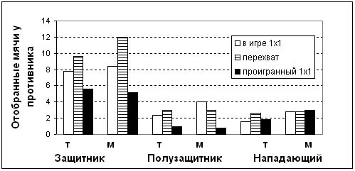 эффективность подачи мяча в сложных ситуациях Показатели, приведенные в таблице 1 и на рис. 4 показывают, что некоторые подачи были главной причиной потери мяча у всех наблюдаемых игроков в тренировочном занятии и матче. Чаще всего во время тренировок и матчей неточно подавал мяч полузащитник (соответственно - 12,0 и 12,8), затем защитник (8,0 и 12,0). Неэффективное ведение мяча наблюдалось в одинаковой степени и у полузащитника и у нападающего. Защитник демонстрировал более эффективное ведение мяча . Анализ общего числа потерянных мячей в соответствии с игровыми позициями игроков подтвердило закономерность командного соперничества. В соответствии с ней, большая часть атакующей игры, а значит и большая частота потерь во время атаки, ложилась на плечи полузащитников и нападающих. Высокая частота потерь мяча из-за защитников во время матчей были одной из наиболее слабых сторон игры. Таким образом частота потерь мяча во время атакующих действий соответствует тенденциям, которые были описаны в литературе [1, 2, 3, 5, 6, 7, 8]. Чаще всего игроки теряли мяч при собственных подачах, в процессе ведения мяча и борьбы. Другие причины, например положение вне игры, были редкостью. С проведенного анализа всех потерянных мячей следует (см.таблица 1), что полузащитник является игроком, который чаще всего совершает технико-тактические ошибки во время атаки. Это связано с наибольшей его "вовлеченностью в игру" (в среднем, на одной тренировке, он отдавал мяч 20 раз, во время матча-18,4 раза). Защитник совершал в среднем 10,8 и 12,8 технико-тактических ошибок во время одной встречи. То есть, в данном случае, имело максимальное приближение содержания игры и тренировочных занятий. В таблице 1 и рис. 5 показаны данные, касающиеся количества отобранных у соперника мячей во время тренировок и матчей. Характеризуются перехваты мяча у противника в игре один на один и обгон. Исследовано также количество проигранных поединков один на один в защите. Из полученных данных следует, что во время тренировочных занятий и матчей чаще всего именно защитник перехватывал мяч в игре один на один (соответственно - 7,8 и 8,4). Реже терял мяч полузащитник (2,4 и 4,0) и нападающий (2,6 и 2,8). Кроме этого защитник в четыре раза чаще других игроков перехватывал мяч и проигрывал больше всего непосредственных единоборств за мяч. В среднем, во время тренировочных занятий он проигрывал 5,6 поединков, а в матчах - 5,2. Рис. 4. Характеристика уровня