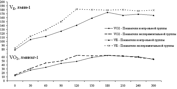 Примечание *р≤0,01, **р≤0,05 Рис.1 Изменение реакций легочной вентиляции и потребления кислорода (по среним данным) в процессе выполнения второго 5 мин отрезка гребли в экспериментальном ( прерывистая линия) и контрольном (сплошная линия) вариантах программ исследований. Из рисунка видно, что спортсмены достигают сходных уровней пиковых величин потребления О2. Наряду с этим отчётливо просматривается тенденция, характеризующаяся тем, что после выполнения специальных внетренировочных воздействий гребцы достигали пиковых уровней аэробной мощности раньше и удерживали "плато" реакции более длительное время. Из рисунка видно также, что специальные массажные воздействия перед повторным выполнением отрезка работы вызывают большее усиление реакции легочной вентиляции, что важно для дыхательной компенсации метаболического ацидоза. Увеличение кинетики потребления О2 и реакции дыхательной компенсации метаболического ацидоза (по усилению реакции вентиляции) может быть свидетельством более высокой степени мобилизации функционального потенциала организма, а также его более высокой устойчивости к метаболическому ацидозу. Вероятно, именно это является одной из причин увеличения работоспособности спортсменов, усиления реализационного эффекта нагрузки под влиянием специальных массажных манипуляций при выполнении повторной 5 мин нагрузки. Имело место значительное снижение скорости восстановления реакций КРС в послерабочем периоде после выполнения экспериментального задания. В этом случае отмечалась выраженная тенденция к снижению уровня индивидуальных различий показателей (коэффициент вариаций снижался почти наполовину по реакции VО2 и еще более заметно по реакции VE). Это позволяет предполагать увеличение степени реализации функционального потенциала организма на фоне выраженного утомления спортсменов. Высокая степень утомления, а также приведенные выше характеристики специальной выносливости, зарегистрированные в процессе выполнения второго 5 мин отрезка, позволяют говорить о более высоком специализированном тренировочном эффекте воздействия повторного выполнения отрезков гребли, при использовании применяемых в данном исследовании средств стимуляции работоспособности между повторениями высокоинтенсивной работы. Выводы: 1. Показано, что использование специализированных внетренировочных средств (специальных массажных манипуляций) для коррекции утомления в процессе повторного выполнения отрезков нагрузки, типичного для тренировочного занятия в гребле, позволяет продлить устойчивое состояние работоспособности. В основе этого лежит увеличение проявления мощности функций КРС, кинетики и устойчивости реакций в условиях утомления на фоне выраженного метаболического ацидоза. 2. Важным элементом коррекции реакции организма при компенсации явлений утомления при использовании специализированных внетренировочных средств является активизация начальной кинетики потребления О2 и увеличение пределов реакции легочной вентиляции. 3. Использование специализированного комплекса массажных манипуляций между повторениями отрезков высокоинтенсивной работы позволяет увеличить реализационный характер повторного режима нагрузки. Это предположительно может увеличивать специфический тренировочный эффект пр