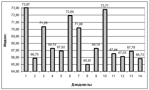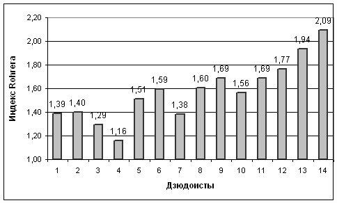 Проведенный корреляционный анализ показал степень взаимосвязи между исследуемыми показателями показал, что из 19 коэффициентов корреляции с местом в рейтинге Польской Федерации Дзюдо (ПФД) 4 имеют среднюю тесноту корреляции, а 16 - низкую. Средний уровень связей обнаружен с: местом в ранговой классификации (экспертных оценок) - r=0,6; возрастом спортсмена (-0,4); тренировочном стажем (r=-0,4). Из морфологических показателей набольшую связь с местом в рейтинге ПФД обнаружено по отношению к ширине локтя (r=-0,3) а также пропорциям тела, выраженных индексом Rohrera (r=-0,3). Из 19 коэффициентов корреляций с ранговой классификацией (экспертными оценками) 8 имеют среднюю степень корреляции, а 11 - низкую. Средний уровень связей обнаружен с: местом в рейтинге ПФД (r=0,6), шириной локтя (r=0,4), шириной таза (r=-0,4), диаметром предплечья (r=-0,4), шириной плеч (r=-0,4), длиной верхней конечности (r=-0,4). Показатели индекса Rohrera сборной команд Польши по дзюдо, представлены на рис. 1. Учитывая классификацию соматотипов по E.Kretschmera [5] можно считать, что только один спортсмен принадлежит к лептосомному типу строения тела, а 4 к атлетическому и 9 к пикническому типам. Средняя, для всей сборной команды, величина этого показателя составляет 1,58 ±0,25. Рис. 1. Степень эктоморфии (по индексу Rohrera) членов сборной команды Польши по дзюдо, n=14 Учитывая пропорции верхней частей тела, дзюдоисты представляют разный тип строения тела (рис. 2). На основе тазо-плечевого индекса, отражающего степень выраженности мужского строения тела, 11 спортсменов принадлежит к типу с очень сильно проявляющейся мужском типом строения тела и только 3 принадлежат к типу со средней выраженностью мужской строения тела. Средняя величина тазо-плечевого индекса сборной команды (х=-69,2±2,78) отчетливо представляет сильно выраженный мужской тип строения тела. Рис. 2. Тазо-плечевые пропорции членов сборной команды Польши по дзюдо, n=14 ДИСКУССИЯ Значение морфологической обусловленности спортивных результатов в спортивной борьбе и особенно в дзюдо чрезвычайно сложный и неоднозначный вопрос. Практика подготовки лучших дзюдоистов мира [10, 11] мира показывает, что высокие спортивные результаты демонстрируют спортсмены с различными типами строения тела. Очевидно, как в большинстве единоборств, разнообразие факторов, влияющих на исход поединков в дзюдо, является причиной того, что, независимо от абсолютных размеров тела борец может формировать собственный стиль борьбы. Именно больше всего исследований в этом направлению было посвящено связи морфологических факторов с техникой борьбы [11, 15, 33]. В связи с этим методически оправданной является поиск таких обусловленности с уровнем мастерства как наиболее обобщенным и многогранным показателем. В наших исследованиях самая высокая зависимость обнаружена, не как можно было ожидать между морфологическими показателями, а между местом спортсмена в рейтинге Польской Федерации Дзюдо и местом в классификации ранговой (экспертных оценок). Это показывает лишь, что (в этом случае) спортивный рейтинг является довольно объективным критерием мастерства. Интересным является обнаруженный в исследованиях практический факт, что оценка ранговая экспертов лучше отражает связи между исследуемыми факторами (8 связи на средним уровнем), чем спортивная классификация (только 4 связи на средним уровнем). В 