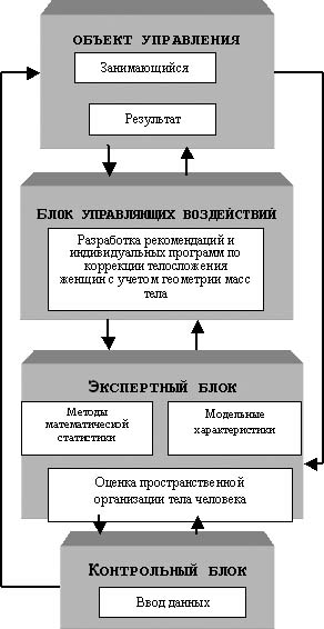 Д.Ю. Луценко [4], создана компьютерная версия программы занятий для женщин, занимающихся фитнессом - "Фитнесс для женщин", с использованием технологии баз данных Microsoft Access 2000. Разработанный программный продукт позволяет получить рекомендуемый им вариант комплекса упражнений в соответствии с возрастом и уровнем физического состояния, а также результатами педагогических наблюдений тренера. Как показывает анализ специальной литературы современные информационные технологии широко используются в оздоровительной физической культуре. Однако эффективных информационно-методических систем для организации физкультурно-оздоровительных мероприятий с различным контингентом занимающихся, получения достоверной надежной информации об эффективности оздоровительного процесса в настоящее время явно недостаточно. Перечисленные положения указывают на актуальность проблемы, что и обусловило выбор темы исследования. Работа выполнена согласно плана научно-исследовательской работы кафедры кинезиологии Национального университета физического воспитания и спорта Украины и Сводного плана НИР в области физической культуры и спорта Государственного комитета Украины по вопросам физической культуры и спорта на 2001 - 2005 гг. по теме: 1.4.3. "Совершенствование биомеханических технологий рекреации и двигательной реабилитации с учетом возрастных особенностей геометрии масс тела человека". Результаты исследования. С целью повышения эффективности занятий оздоровительным фитнессом женщин первого зрелого возраста нами создана информационная система "PERFECT BODY", разработанная на основе методики коррекции телосложения женщин с учетом геометрии масс тела. Структура информационной системы "PERFECT BODY" представлена контрольным блоком; экспертным блоком; блоком управляющих воздействий с индивидуальными тренировочными программами, направленными на профилактику и коррекцию нарушений пространственной организации тела занимающихся (рис. 1). Рис.1. Блок-схема автоматизированной системы "PERFECT BODY" При создании программы "PERFECT BODY" использовалась среда программирования Visual Basic 6.0, которая является частью пакета Visual Studio 6.0, содержащей множество средств для работы с проектом на всех стадиях разработки, она наиболее удобна и эффективна для написания приложений под Windows, обладает широким набором визуальных средств, элементов управления, простой внедряемостью OLE. При проектировании базы данных учитывались общие стратегические подходы: