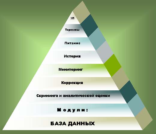 Данные таблицы создаться в среде СУБД Access следующим образом: в окне базы данных - вкладка "Таблицы" - "Создать таблицу в режиме конструктора". В поле название устанавливаем название, в поле тип - указанный в таблице тип. Выделяем ключевое поле и нажимаем кнопку "ключевое поле", сохраняем таблицу. Доступ к данным осуществляться программно, поэтому нет необходимости устанавливать связи между таблицами, поскольку контроль целостности данных осуществляется в программе. База данных представляет собой автоматизированную систему, имеющую модульную структуру (рис. 2). В базе данных нами выделено семь модулей. Модуль справка - включает в себя информацию о структуре базы данных и возможности доступа к ней посредством системы управления базами данных. Инструкция для работы с программой помогает пользователям получить ответы на возникающие у них вопросы и решить проблемы, связанные с получением требуемой информации. Рис. 2. Блок схема базы данных информационной системы Модуль термины - включает в себя информацию, которая раскрывает понимание и толкование профессиональных терминов, которые встречаются в работе инструктора рекреолога. Модуль скрининга и аналитической оценки - позволяет получить количественную информацию о физическом развитии, пространственной организации биозвеньев тела, физической подготовленности занимающихся, а также сравнивать индивидуальные значения со среднестатистическими показателями в рамках выборочного метода. Модуль коррекция - включает в себя информацию об особенностях организации педагогического процесса, направленного на изменение геометрии масс тела человека, биомеханических свойств скелетных мышц, биодинамики суставно-связачного аппарата, повышение уровня физической подготовленности и адаптационных резервов организма занимающихся. Модуль мониторинг - является обязательным элементом управленческого процесса. В оздоровительной физической культуре его использование предполагает получение, обработку и анализ данных, отражающих определенный завершенный временной этап или цикл, на основании которых определяется необходимая направленность последующих педагогических воздействий. На основании полученных данных проводится сравнение фактических и прогнозируемых показателей, полученных в результате оздоровительных занятий, и вносятся соответствующие коррективы в тренировочный процесс. Модуль питание - включает в себя данные о рациональном питании, информацию о связи физических упражнений с питанием, методику расчета индивидуального режима питания, таблицы для самостоятельного расчета рациона питания. Модуль история - содержит ретроспективную информацию о становлении и тенденциях развития оздоровительных технологий, теоретические сведения о геометрии масс тела человека, средствах и методах ее измерения. Разработанная информационная система "PERFECT BODY" в первую очередь направлена на решение методических задач в соответствии с индивидуальными особенностями пространственной организации биозвеньев тела занимающихся, так как пользователь имеет возможность выбирать усредненные варианты уроков с учетом геометрии масс тела и уровнем физической подготовленности. В настоящей версии компьютерной программы предусмотрена возможность для систематического обновления информации в 