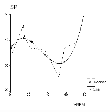 РБ3*%Б3/%Б3г+2,5Г+1,5Ч+1,3С)-К*Т/200+1,5*Пп где: S+ - сумма набранных "положительных" очков; S- - сумма "отрицательных" очков за ошибки в нападении и защите; Т - время участия в игре; РБ1 - результативность игрока, набранная 1-очковыми бросками; БЫ1 - процент попаданий 1-очковых бросков; Бм1- процент попаданий 1-очковых бросков по модельным данным; РБ2 - результативность игрока, набранная 2-очковыми бросками; БЫ2 - процент попаданий 2-очковых бросков; Бм2- процент попаданий 2-очковых бросков по модельным данным; РБ3 - результативность игрока, набранная 3-очковыми бросками; БЫ3 - процент попаданий 3-очковых бросков; Бм3 - процент попаданий 3-очковых бросков по модельным данным; А - количество атакующих передач; О - количество овладений мячом, отраженных бросков; П - количество перехватов мяча; С - количество взятых отскоков возле своего щита; Ч - количество взятых отскоков возле щита соперника; Гг - количество потерь мяча; Ф - количество фолов; К - количество очков, полученных командой в игре. В исследовании приняли участие игроки основного состава команды "Политехник". Были проанализированные данные игровой результативности и эффективности игроков основного состава команды. Всего было проанализировано 11 игр. Результаты исследования показали, что практически у всех игроков динамика игровой результативности имеет определенные закономерности. Так, практически для всех игроков взаимосвязь количества "положительных" очков и временного интервала проведения соревнований оказалась нелинейной, с индивидуальными более или менее выраженными подъемами и спадами. Результаты регрессионного анализа этих нелинейных зависимостей показали, что у обследуемых игроков зависимость эффективности игровых действий от временного интервала (даты) проведение игры подчиняется кубической функции. Например, у игрока П-ова данная зависимость описывается кубическим уравнением регрессии, которая имеет следующий вид: S+ = 36,36 + 0,69Т - 0,032Т2 + 0,00033Т3 Рис. 1. График кубической регрессии взаимосвязи количества "положительных" очков, набранных в игре (SР), и временного интервала проведения игры (VREM) у игрока П-ова (Observed-значение, которое наблюдаются, Cubic- значение кубической функции) Таблица 1 Часть корреляционной матрицы показателей игровой эффективности и значений индивидуальных биоритмов для игрока П-ова (выделены достоверные значения при р<0,05)