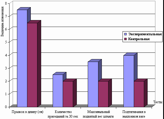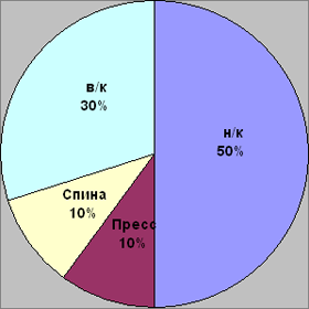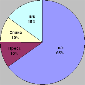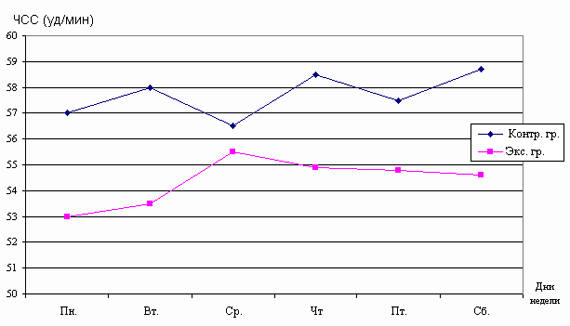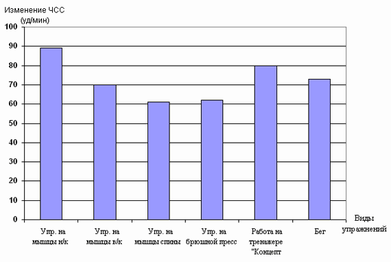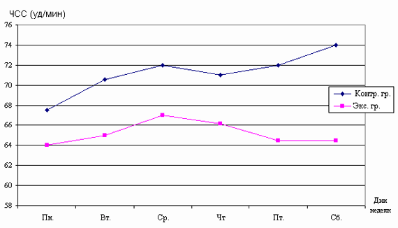 Рис. 1. Распределение времени выполнения упражнений, направленных на развитие мышц верхних, нижних конечностей, спины, пресса в процессе тренировочного занятия. Во вторник и пятницу спортсмены выдерживали одинаковую по величине нагрузку. Различие тренировочных программ в эти дни при сохранении общего тренировочного объема было обусловлено изменением числа заданных серий, а также временем, затрачиваемым на его выполнение. В субботу, несмотря на однотипные задания со средой (бег), величина нагрузки уменьшалась. Для внесения корректив в тренировочный микроцикл для экспериментальной группы нами была исследована динамика изменения пульса, вызываемая нагрузкой, влияющей на различные группы мышц. Как видно из рисунка 2, наибольшие изменения частоты сердечных сокращений вызывают упражнения силового характера, выполняемые с преимущественным вовлечением мышц нижних конечностей: приседания "пистолетик", выпрыгивания и т.д. (колебания пульса до и после выполнения нагрузки находятся на уровне значений 89 ударов в минуту). Рис. 2. Изменение частоты сердечных сокращений под влиянием упражнений, воздействующих на различные группы мышц Несколько меньшие изменения вызывает работа на гребном тренажере "Концепт" (ЧСС в среднем возрастает на 80 ударов в минуту). Третью позицию занимают упражнения бегового характера (увеличение пульса происходит на 73 удара). В порядке уменьшения степени воздействия на изменение значений ЧСС дальше располагаются упражнения на верхний плечевой пояс, мышцы брюшного пресса и спины (после выполнения упражнений пульс возрастает соответственно на 70; 62; и 61 удар в минуту). Проанализировав полученный цифровой материал, было принято решение увеличить нагрузку за счет дополнений в тренировочных программах, выполняемых в четверг и субботу. Таким образом, ударный микроцикл для спортсменов экспериментальной группы приобрел следующий вид: Понедельник 1. Приседания со штангой весом 40 кг. (4 подхода по 70 раз, отдых между подходами 8 минут). Вторник Работа на гребном тренажере "Концепт"; 4 подхода по 20 минут (темп 12-14 раз, усилие максимальное). Между подходами отдых 20 минут. Среда. Бег 120 минут (ЧСС 150 - 156 ударов в минуту). Четверг. 1. Приседания с гирей весом 32 кг (4 подхода по 100 раз, между подходами отдых 8 минут). Пятница. Работа на гребном тренажере "Концепт"; 2 подхода по 30 минут каждый (темп 12-14 раз, усилие максимальное), отдых между подходами 20 минут. Суббота 1. Бег 90 минут, ЧСС 150-156 ударов в минуту. Помимо изменений в подборе тренировочных заданий спортсменам экспериментальной группы, начиная с четверга, т.е. с момента, когда вступала в силу измененная тренировочная программа, перед каждым занятием внушалось умение управлять своими внутренними механизмами, хорошо переносить заданные нагрузки, быстро восстанавливаться после них. Значения ЧСС, зафиксированные утром у спортсменов обеих групп, позволили выявить скачкообразный характер восстановления пульса к началу нового дня тренировок в контрольной группе и период стабильного восстановления частоты сердечных сокращений к исходному уровню в экспериментальной группе, начиная со среды (рис. 3). Рис. 3. Динамика изменений величин ЧСС (утро) под влиянием нагрузок ударного микроцикла у спортсменов контрольной и экспериментальной групп Несколько иную картину позволяют увидеть значен