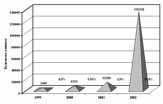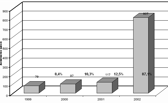 Рис.2 Динамика охвата учеников дополнительными уроками физической культуры Над всеми этими проблемами сегодня трудятся много людей. В школе города Житомира физическая культура проводится пять раз в неделю в 1-11 классах. За счет дополнительных часов увеличился объем теоретического раздела программы, который направлен на воспитание у учеников осознанного отношения к своему здоровью и физическому развитию. Ученики 1-3 классов каждую неделю посещают городской бассейн (2часа) и преподается предмет "Основы хореографии", в 10-11 классах - курс "Основы массажа". Введены физкультминутки, физкультпаузы, игры на переменах. В 1-3 классах ведут дневник физического развития. Начиная с 3 класса, ученики занимаются в секциях по 12 видам спорта (А. Полулях, 2002). Необходимость повышения двигательной активности учащихся средних общеобразовательных учреждений доказывается уже давно. На всех уровнях утверждаем: два урока физической культуры в неделю практически неспособны обеспечить надлежащее управление процессом физического развития школьников и их двигательной подготовленности. Высчитали даже проценты надлежащей реализации задач (11%) при двух урочной системе (А.И.Селезнев, 2002). Простое увеличение количества занятий тоже не панацея (даже если их окажется шесть в неделю). Очень важно понимание того, что само по себе увеличение количества занятий не самое главное из того, что надо предпринять. Это меньше, чем полдела. Еще более важно их рациональное использование. Упование лишь на увеличение количества учебного времени без кардинального изменения методики неизбежно приведет к бездарной потере большей части средств, дискредитации самой этой идеи, демонстрации непростительно низкого уровня профессионализма (В.П. Лукьяненко). В Китайской Народной Республике обучение в 9-летней школе физическому воспитанию выглядит следующим образом: 1-2 классы - 2 часа в неделю; 3-9 классы - 3 часа. Всего за 9 лет - 844 учебных часа, что составляет 10,5% от общего объема учебного времени. Затем после 9-летней школы идет полная трехлетняя средняя школа, физическое воспитание которой входит в число обязательных предметов. На него отводится 2 часа в неделю. Кроме того, в полной средней школе по программе внеклассной работы на каждом году обучения 3 часа в неделю уделяют занятиям спортом. При наличии соответствующих условий в городских школах также проводят дополнительные занятия по физическому воспитанию. В каждой начальной и средней школе есть секции для классных и внеклассных занятий по физической культуре, в каждом высшем учебном заведении кафедра физического воспитания или спортивный комитет, которые руководят работой по физической культуре и спорту. Во всех учебных заведениях с учетом местных условий широко практикуется создание команд по различным видам спорта для участия в соревнованиях (В.З. Клепиков, Г.П. Клепикова, 2002). На городском семинаре "Современный урок физической культуры в общеобразовательной школе", в котором принимали участие лучшие учителя города Москвы (50 человек), Л.Е. Сурков продемонстрировал наглядно содержательный видеоматериал с урочными занятиями по разработанной им комплексной программе. На уроки физической культуры отведены 3 часа в неделю, а к спортивному залу добавлен переоборудованный актовый зал ("ФК в школе", 2001). Из вышеизложенного мож