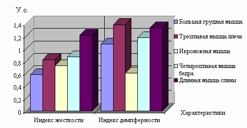 БИОМЕХАНИЧЕСКИЕ СВОЙСТВА МЫШЕЧНОЙ СИСТЕМЫ ВЫСОКОКВАЛИФИЦИРОВАННЫХ ВОЛЕЙБОЛИСТОВ Гаркуша С.В. Черниговский государственный педагогический университет имени Т.Г.Шевченко . В работе рассмотрены актуальные проблемы изучения свойств мышечной системы волейболистов высокой квалификации. Определены количественные показатели биомеханических свойств скелетных мышц, которые берут активное участие в выполнении двигательных действий. Ключевые слова: мышечная система, биомеханические свойства мышц. Анотацiя. Гаркуша С.В. Бiомеханiчнi властивостi м'язовоi системи висококвалiфiкованих волейболiстiв. В роботi розглянуто актуальнi проблеми вивчення властивостей м’язовоi системи волейболiстiв високоi квалiфiкацii. Визначенi кiлькiснi показники бiомеханiчних властивостей скелетних м’язiв, якi беруть активну участь у виконаннi рухових дiй. Ключовi слова: м’язова система, бiомеханiчнi властивостi м’язiв. Annotation. Garkusha S.V. Mechanical properties of a muscle system of highly qualified volleyball-players. In work the urgent problems of learning of properties of the muscular system volleyball players of high qualification are considered. The quantitative parameters of biomechanical properties of skeletal muscles are defined which take awake involvement in execution of motorial operations. Key words: the muscular system, biomechanical properties of muscles. Постановка проблемы. Теория и практика тренировочного процесса свидетельствует о том, что его эффективная организация возможна только при условии объективной оценки состояния двигательной функции спортсменов при достаточно строгом учете и регламентации специальных физических нагрузок. Высокие результаты при этом могут быть достигнуты лишь при эффективном управлении тренировочным процессом. Вполне очевидно, что проблема высокого качества управления может быть успешно решена только при использовании надежного и объективного аппарата педагогического контроля. В процессе спортивной тренировки ее успех зависит от степени точности и достоверности той информации, которой располагает тренер о спортсмене. В этой связи многие специалисты приходят к мнению о том, что разработка методов и средств педагогического контроля, внедрение их в широкую практику подготовки спортсменов является наиболее существенной мерой повышения эффективности всего учебно-тренировочного процесса [2, 4]. Работа выполнена по плану НИР Черниговского государственного педагогического университета имени Т.Г.Шевченко. Анализ последних исследований и публикаций. Ряд авторов высказывают предположение о том, что сила, скорость и экономичность спортивных достижений во многом зависят от того, в какой степени спортсменам удается использовать биомеханические свойства своего двигательного аппарата [1, 3, 5]. Данные специальных исследований (Кашуба В.А., 1993; Ясякевич В., 1997) показали, что управление функциональным состоянием спортсменов требует более динамичной и объективной оценки состояния их мышечной системы. Такая задача, по-видимому, может быть решена при помощи изучения показателей, характеризующих биомеханические свойства скелетных мышц. Формулировка целей статьи. Цель работы - изучить биомеханические свойства скелетных мышц спортсменов, которые принимают активное участие в выполнении основных технических действий в волейболе. Результаты исследований. С помощью метода миотонометрии был проведен анализ биомеханических свойств скелетных мышц волейболистов высокой спортивной квалификации. Исследовались мышц