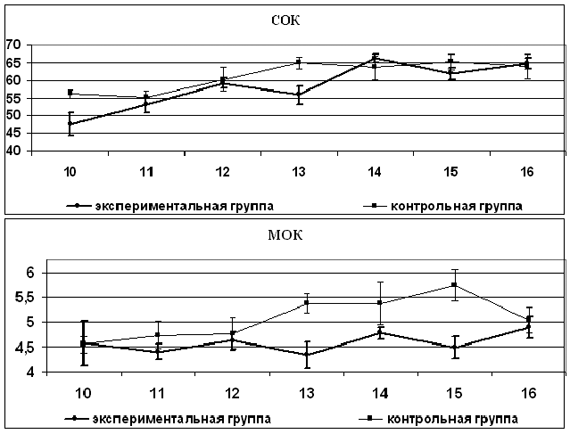 В соответствии с приведенными данными в большинстве изученных возрастных групп нам не удалось зарегистрировать статистически достоверных различий в отношении величин СОК и МОК. Подтвердили данный вывод и материалы сравнительного анализа среднегрупповых значений параметров, характеризующих сократительную функцию миокарда (по СОК 58,32± 2,51 мл в экспериментальной группе и 61,29± 1,60 мл - в контрольной, по МОК - соответственно 4,59± 0,07 л/мин и 5,08± 0,16 л/мин). Вместе с тем необходимо отметить тенденцию к более низким значениям МОК в состоянии относительного покоя у девочек-спортсменок, что служит подтверждением более высокого уровня тренированности их организма. Рис. 1 Возрастная динамика величин СОК и МОК у девочек контрольной и экспериментальной групп от 10 до 16 лет Анализ возрастной динамики величин СОК и МОК позволил установить следующее. Возрастные изменения систолического объема крови у представительниц контрольной и экспериментальной групп были практически идентичными, за исключением возрастного периода 12-14 лет. Напротив, начиная с 12 лет и до окончания изучаемого возрастного периода возрастные изменения МОК у девочек-спортсменок были "зеркальным" отображением колебаний данного параметра, зарегистрированного у школьниц, не занимающихся спортом. Наиболее "критическим" периодом адаптации изученных гемодинамических показателей при адаптации к систематическим физическим нагрузкам следует признать возраст 13 лет, характеризующийся сочетанным падением величин СОК и МОК. Не удалось зарегистрировать статистически достоверных различий между школьницами контрольной и экспериментальной групп и в отношении величин объема сердца (Vс). Таблица 2 Величины объема сердца (Vс) у девочек контрольной и экспериментальной групп в возрасте от 10 до 16 лет (М± м).