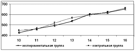 Представленные в таблице 3 данные свидетельствуют о том, что практически во всех возрастных группах у школьниц-спортсменок и у девочек, не занимающихся спортом, значения объема сердца были близки друг к другу. Очевидно, в данном возрастном диапазоне (10-16 лет систематические занятия спортом не приводят к соответствующим перестройкам на морфологическом уровне). Определенным подтверждением данному предположению послужили и данные сравнительного межгруппового анализа по среднему уровню объема сердца не показывают статистически значимых различий в отношении значений объема сердца (553,4± 30,46 см3 у представительниц контрольной группы и 541,57± 32,25 см3 у школьниц-спортсменок). Практически идентичный характер был зарегистрирован нами и при анализе возрастных изменений объема сердца у представительниц контрольной и экспериментальной групп. В соответствии с графиками, представленными на рисунке 2, с возрастом у девочек обеих групп наблюдался естественный прирост данного показателя. Рис. 2 Возрастная динамика величин Vс у девочек контрольной и экспериментальной групп от 10 до 16 лет Более выраженные межгрупповые различия были отмечены нами при анализе других гемодинамических показателей. Как видно из таблицы 3 для школьниц-спортсменок практически во всех возрастных группах была характерна либо выраженная тенденция, либо явная достоверность к более оптимальным величинам общего периферического сопротивления крови (ОПС) и сердечного индекса (СИ). Таблица 3 Величины общего периферического сопротивления крови (ОПС) и сердечного индекса (СИ) у девочек контрольной и экспериментальной групп в возрасте от 10 до 16 лет (М± м)