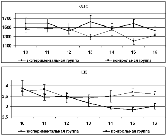 Учитывая тот факт, что данные показатели характеризуют особенности регуляции сердечной деятельности и степень согласованности работы центральных и периферических звеньев кровообращения, можно предположить, что именно за счет этих физиологических механизмов и осуществляется процесс адаптации системы центральной гемодинамики к систематическим физическим нагрузкам. Важно отметить при этом, что более высокие значения величин ОПС у представительниц экспериментальной группы свидетельствуют в пользу повышения прочности сосудов аппарата кровообращения, а, напротив, более низкие значения СИ могут служить подтверждением перехода организма школьниц-спортсменок на более оптимальный эукинетический тип регуляции сердца. В этом отношении необходимо указать на тот факт, что у представительниц контрольной группы в этом возрастном диапазоне регистрировался менее благоприятный гиперкинетический тип регуляции сердечной деятельности. Выраженные межгрупповые различия были отмечены нами и при анализе возрастной динамики значений ОПС и СИ. Как видно из графиков, представленных на рисунке 3, с возрастом для девочек экспериментальной группы было характерно благоприятное снижение величины сердечного индекса и повышение значений ОПС. У школьниц контрольной группы регистрировался практически противоположный характер возрастных колебаний ОПС и СИ. Рис. 3 Возрастная динамика величин ОПС и СИ у девочек контрольной и экспериментальной групп от 10 до 16 лет Полностью подтвердили приведенные выше результаты и материалы сравнительного анализа величин, характеризующих производительность работы сердечно-сосудистой системы (индекс Робинсона - ИР) и ее эффективность (коэффициент экономичности кровообращения - КЭК). Таблица 4 Величины индекса Робинсона (ИР) и коэффициента экономичности кровообращения (КЭК) у девочек контрольной и экспериментальной групп в возрасте от 10 до 16 лет (М± м)