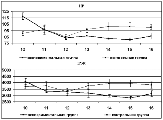 Представленные в таблице 4 экспериментальные данные свидетельствуют о том, что в большинстве изученных возрастных групп для девочек-спортсменок были характерны достоверно более оптимальные величины ИР и КЭК. Более того, и средний уровень КЭК у представительниц экспериментальной группы был достоверно более низким, чем у девочек контрольной группы (соответственно 3253,88± 152,93 а.е. и 3748,29± 81,40 а.е.). Выраженные различия были зарегистрированы нами и при анализе возрастной динамики интегральных расчетных показателей системы центральной гемодинамики обследованных школьниц. Как видно из рисунка 4 вновь, начиная с возраста 12 лет для девочек-спортсменок были характерны более оптимальные, в сравнении с их сверстницами из контрольной группы, возрастные колебания ИР и КЭК. С возрастом у школьниц, систематически занимавшихся спортом, наблюдалось постепенное, но явно выраженное, понижение величин индекса производительности работы сердца и коэффициента экономичности кровообращения. Рис. 4 Возрастная динамика величин ИР и КЭК у девочек контрольной и экспериментальной групп от 10 до 16 лет Выводы. Таким образом, приведенные в данном исследовании экспериментальные материалы свидетельствуют о том, что в ходе адаптации к физическим нагрузкам для развивающегося организма характерен переход на наиболее благоприятный и эффективный тип регуляции работы сердечной мышцы. Несомненное практическое значение имеют и данные относительно характера возрастной динамики основных параметров системы центральной гемодинамики для проведения тренировочных занятий с детьми школьного возраста. Кроме этого, полученные результаты позволили констатировать достаточно высокую информативность использованной нами в работе компьютерной диагностической программы "ШВСМ" и возможность ее практического использования в системе медико-биологического контроля. Дальнейшие исследования предполагается провести в направлении изучения других проблем возрастных изменений некоторых гемодинамических показателей у девочек 10-16 лет при систематических занятиях гандболом. Литература: