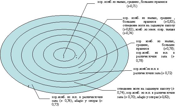 ВЗАИМОСВЯЗЬ СПЕЦИАЛЬНОЙ И ХОРЕОГРАФИЧЕСКОЙ ПОДГОТОВКИ ЮНЫХ АКРОБАТОВ Лысенко Э.А. Харьковская государственная академия физической культуры . В статье рассмотрены основные параметры специальной и хореографической подготовленности акробатов-прыгунов на этапе базовой подготовки. Ключевые слова: спортивная акробатика, коэффициент корреляции, хореографическая подготовка. Анотацiя. Лисенко Е.О. Взаемозв'язок спецiальноi та хореографiчноi пiдготовки юних акробатiв. У статтi розглянутi основнi параметри спецiальноi та хореографiчноi пiдготовленостi акробатiв-стрибунiв на етапi базовоi пiдготовки. Ключовi слова: спортивна акробатика, коефiцiент кореляцii, хореографiчна пiдготовка. Annotation. Lusenko E.O. Interconnection of special and choreographic preparation of junior acrobats. This article deals with the basic parameters of special and choreographic preparedness of acrobats - jumpers in the stag of basic preparation. Key words: sports acrobatics, coefficient of correlation, choreographic preparedness. Введение. Хореография давно и прочно стала неотъемлемой частью технической подготовки гимнастов. Хореографическая подготовка в спортивных видах гимнастики - это система упражнений и методов воздействия, направленных на формирование "школы движений", воспитание двигательной культуры спортсмена, расширение арсенала выразительных средств (Т.С. Лисицкая, 1984; Ж.А. Белокопытова, А.А. Тимошенко, 2000; И.А. Шипилина, 2004) [2,8,9,10]. Для акробатики характерна значительная эмоциональная напряженность тренировочной деятельности, спортсменам необходимо высокое самообладание, умение сохранять способность управления своими движениями. В связи с постоянным увеличением сложности соревновательных упражнений успехов добиваются смелые и решительные акробаты, овладевшие всеми видами спортивной подготовки. Концепция "переноса тренированности" [1,3,4,7] позволяет с помощью средств хореографии работать над физическими качествами акробатов-прыгунов. Программный материал по хореографии на этапе базовой подготовки в спортивной акробатике [6,7] включает в себя упражнения на "вращательную" подготовку, воспитание функции равновесия и "прыжковую" подготовку, а также упражнения на развитие активной и пассивной гибкости, силы ног, координации. Во второй части этапа базовой подготовки на уроках хореографии увеличивается количество элементов, выполняемых во вращении на двух, одной ноге, на месте, в продвижении, с опорой и в воздухе. В основной части урока хореографии, на середине предусматривается выполнение большого разнообразия различных сложнокоординационных прыжков на месте, в продвижении, в повороте. Для формирования собственного стиля исполнения спортсменам предлагается разнообразная программа из различных видов танцев, выполнение движений в современных ритмах [6]. Проблема совершенствования хореографической подготовки в спортивной акробатике с учетом взаимосвязи основных параметров специальной и хореографической подготовленности является своевременной и актуальной. Работа выполнена по плану НИР Харьковской государственной академии физической культуры. Формулирование целей работы. Цель исследования - выявить взаимосвязь основных параметров специальной и хореографической подготовленности акробатов- прыгунов на этапе базовой подготовки. Объект исследования - тренировочный процесс по спортивной акробатике юношей в акробатических прыжках. Предмет исследования - особенности хореографи