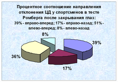Рис.1. Диаграмма процентного распределения обследованных спортсменов по параметру "направление смещения центра давления тела после закрывания глаз" в усложненном тесте Ромберга (N=406) Выводы. Стабилографический контроль в рамках комплексного обследования спортсменов позволяет своевременно оценивать функциональную подготовленность спортсменов, проводить коррекцию тренировочного процесса и реабилитационных мероприятий, так как результаты проведенных обследований сразу доводятся до сведения главных тренеров команд в виде заключений и конкретных рекомендации (комплексы упражнений для коррекции кинетической устойчивости тела спортсмена). По нашему мнению, учитывая индивидуальные особенности соотношения биомеханических параметров устойчивости, исследуя уровень кинетической устойчивости тела спортсмена обязательно в динамике, можно адекватно анализировать уровень технического мастерства, разрабатывать современные технологии спортивной тренировки и реабилитации. Комплексы упражнений с использованием программ компьютерных игр-тренажеров с биологической обратной связью мы рекомендуем для применения в тренировочном и реабилитационном процессах спортсменов различной квалификации и специализации. Дальнейшие наши исследования направлены на использование компьютерной стабилографии в двухплатформенном (билатеральном) варианте, который может представлять интерес, например, в отработке приемов штангистов, в выборе стойки у стрелков или в формировании акробатических пар, троек и четверок, в отработке поз и положений у фигуристов. Литература.