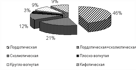 При сочетании лордотической и сколиотической осанки на ряду с увеличением поясничного лордоза выявлено асимметричное положение лопаток, которое наблюдалось больше у девочек, показатели l1 (слева) - 9,1±0,8 от.ед, l1 (справа) - 8,0±0,4 от.ед, асимметрия надплечий незначительная l2 (слева) - 10,4±1,3 от.ед, l2 (справа) - 10,0±1,1 от.ед, выявлена асимметрия гребней подвздошных костей l4 (слева) - 6,4±0,5от.ед, l4 (справа) - 5,8±0,4 от.ед, а также сглаживание контура талии, которое превалировало у мальчиков (l3 (слева) - 11,1±1,1 от.ед, l4 (справа) - 10,6±1,5 от.ед). В сагиттальной плоскости, выявлено значительное смещение точек проекции акромиально-ключичного сочленения, тазобедренного и голеностопного сустава от срединной линии, которое более выражено у девочек. При анализе биогеометрического профиля у детей со сколиотической осанкой во фронтальной плоскости определили значительную асимметрию положения лопаток, надплечий, треугольников талии и гребней подвздошных костей, как у мальчиков, так и у девочек (табл. 1,2). В сагиттальной плоскости наблюдалось отклонение точки проекции акромиально-ключичного сочленения, тазобедренного сустава, голеностопного сустава, у мальчиков более значительно, чем у девочек, причем у девочек отклонения точки проекции голеностопного сустава от срединной линии не выявлено. Кругло-вогнутую спину определили только у мальчиков. В сагиттальной плоскости выявили увеличение, как грудного кифоза, так и поясничного лордоза (l5 - 5,5±0,1 от.ед, l6 - 6,7±0,2 от.ед), а также смещение точки акромиально-ключичного сочленения назад l7 - 4,2±1,3 от.ед, а точек проекции тазобедренного и голеностопного сустава вперед l8 - 2,4±0,1 от.ед. l9 - 3,2±0,2 от.ед, во фронтальной плоскости - незначительная асимметрия гребней подвздошных костей. Выводы. 1. Признаки недифференцированной дисплазии соединительной ткани были выявлены у 91,6% детей. 2. Наряду с дисплазией при данном обследовании у 86,4% детей выявлена патология позвоночника, при этом у 47% детей наблюдались нарушения осанки, у 44,6 % - сколиоз. 3. У детей с нарушением осанки преобладала НДСТ легкой и средней степени тяжести. Дальнейшее направление исследований. Выявление нарушений биогеометрического профиля осанки у детей и симптомов дисплазии соединительной ткани на этом фоне позволяет отнести их в группу риска появления патологии позвоночника и своевременно назначить профилактическое лечение. Литература: