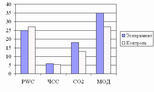 Примечание: *- Р<0.05 В результате увеличения физической работоспособности совершенствуются функции всех систем организма [6]. Это касается, прежде всего, систем, обеспечивающих мышечную деятельность. Представляло интерес, как занятия по предложенной методике сказались на динамике функционального состояния кардиореспираторной системы в покое. Анализ цифрового материала показал, что частота сердечных сокращений снизилась как в экспериментальной (Р<0,05), так и в контрольной группе (Р<0,05) (табл. 1). Таким образом, в процессе адаптации к действию активной дыхательной смеси (АДС) ЧСС имеет выраженную тенденцию к снижению, характерную и для адаптации к мышечным нагрузкам. Минутный объем дыхания отражает резервные возможности кардиореспираторной системы. При этом оказалось, что МОД, как в процессе ходьбы, так и в процессе имитационной тренировки значительно снижается (Р<0,001). Это свидетельствует о более экономном дыхании у тренированных лиц, что в свою очередь подтверждается достоверным ростом процента содержания углекислого газа артериальной крови в обеих группах (табл. 1). Содержание в артериальной крови углекислого газа СО2 в состоянии покоя - ключевой показатель, наиболее обобщенно отражающий степень отклонения от нормы основных физиологических и биохимических процессов в организме человека. От % содержания в артериальной крови СО2 зависит степень кровоснабжения (обеспечения кислородом) всех клеток организма. Очевидно, что только больший (Р<0,05) прирост данного показателя в экспериментальной группе по сравнению с контрольной (рис. 1) обеспечил занимающимся должный тренировочный эффект. Проведение всего лишь четырехнедельного курса инспираций гиперкапническими газовыми смесями значительно активизировало процесс утилизации кислорода клетками организма. Рис. 1 Процент изменения функциональных показателей у испытуемых за время эксперимента Выводы. Сравнение достигнутых уровней рассматриваемых показателей не выявило достоверного отличия по физической работоспособности и ЧСС в экспериментальной и контрольной группе (рис. 1). И те, кто регулярно получал двигательную нагрузку (контрольная группа) и те, кто ее имитировал, изменили оценку своей работоспособности со "средней" до "выше средней" для соответствующей возрастной категории [2]. Данный факт наряду с достоверно большим снижением легочной вентиляции и более выраженной (Р<0,05) гиперкапнией в экспериментальной группе (рис. 1) говорит о том, что использование внешнесредового фактора - активной дыхательной смеси, формирующейся в процессе естественного дыхания на капникаторе (физкультурном имитаторе) является еще одним возможным тренировочным способом достижения необходимого для нормальной физиологии организма человека уровня физической подготовки. Таким образом, окружающая человека среда, ранее рассматриваемая в физкультурной деятельности только как фактор, дополняющий тренировку [3], может быть преформированна в фактор самостоятельного тренировочного воздействия - физкультурную имитацию. Дальнейшие исследования предполагается провести в направлении изучения других проблем имитационной тренировки как способа оздоровления лиц пожилого возраста. Список литературы.