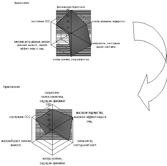 Анализ достоверности различий результатов тестирования баскетболистов разного амплуа по t-критерию Стьюдента показал, что более, чем две трети результатов тестирования достоверно различаются у представителей разного игрового амплуа не только по показателям тестов по физической и технической подготовленности, но и по биохимическим и психофизиологическим показателями. Это указывает на то, что принадлежность к определенному игрового амплуа каждого игрока - это не только чисто визуальные расхождения в антропометрических показателях, но и расхождение в показателях более глубоких функций, т.е. физиологических, биохимических и психофизиологических. В нашем случае оказалось, что антропометрические данные - далеко не единственныйи не основной критерий для определения функции игрока. Следующий этап - создание индивидуальных профилей игроков. Индивидуальные значения факторов подготовленности и результаты кластерного анализа были объединены и составлены индивидуальные профили баскетболистов с уточнением их игровых функций. Вот примеры индивидуальных профилей некоторых баскетболистов. Аналогичные данные были получены для баскетбольной команды Горловского педагогического университета иностранных языков. Данный алгоритм был эффективно применен также при построении индивидуальных программ для баскетболисток команды "БК-21 век". Было выявлено, что у баскетболисток высокой квалификации в подготовительном периоде количество достоверных взаимосвязей между различными показателями подготовленности меньше по сравнению с соревновательным периодом [5]. Это свидетельствует о том, что по мере развития спортивной формы повышается степень структурированности системы, которой является баскетбольная команда. Кроме того, была выявлена значительная роль психофизиологических факторов в структуре подготовленности баскетболисток высокого класса и составлены факторные модели каждого игрока. Данный алгоритм был успешно применен также для разработки индивидуальных приграмм для игроков либеро волейбольной команды "Харкiв’янка" (рис. 6), в результате применения которых была качественно улучшена структрура их подготовленности, а один из игроков либеро был признан лучшим на Украине. В женской баскетбольной команде ХНПУ игроки были разбиты на группы не по функциям, а по стажу занятий баскетболом [6]. Данный алгоритм был применен при определении индивидуальных особенностей адаптивных систем и планировании восстановительных мероприятий баскетболистов ХНПУ на основе математического анализа показателей сердечного ритма и концентрации инсулина и кортизола в крови. Для управления такой системой, как спортсмен или команда, необходимо применение второго аспекта системного анализа - анализа динамичности системы. Как показали исследования второго направления предложенной схемы, т.е. определение индивидуальной динамики показателей соревновательной эффективности квалифицированных баскетболисток, колебания данных показателей являются гармоничными, т.е. описываются синусоидальными функциями с периодом 25-30 дней. Рис. 6. Изменение индивидуальной факторной структуры волейболистки К-ой (мс) в результате применения методики развития психофизиологических функций Это свидетельствует о том, индивидуальная соревновательная эффекти