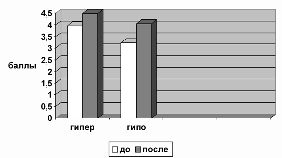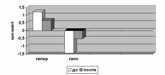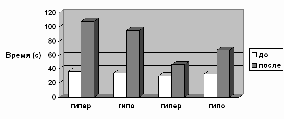 Результаты исследований и их анализ. Полученные результаты исследования свидетельствуют о том, что коррекционные воздействия способны изменить тип вестибуловегетативной реакции и вестибулярную устойчивость у спортсменов. У спортсменов с гиперкинетическим типом реакции после вестибулярных тренировок существенно (p< 0,05) улучшилась вестибулярная устойчивость по результатам теста Лозанова-Байченко (рис.1). До вестибулярных тренировок вестибулярная устойчивость составляла 3,96+0,23 балла, после соответственно 4,49+0,22 балла. Снижение реактивности сердечно-сосудистой системы на данное воздействие свидетельствует о снижении чувствительности рецепторов вестибулярного аппарата, что и объясняет улучшение вестибулярной устойчивости. Рис. 1. Изменение вестибулярной устойчивости по Лозанову-Байченко у спортсменов с гиперкинетическим и гипокинетическим типами реакций до и после коррекционной программы. Рис. 2. Изменение вестибуловегетативного типа реакции у спортсменов с гиперкинетическим и гипокинетическим типами реакций до и после коррекционной программы. А Б Рис. 3. Изменение времени вестибулярной устойчивости по пробе Ромберга (А) и тесту Яроцкого (Б). У спортсменов с гипокинетическим типом реакции после вестибулярных тренировок и аэробных нагрузок существенно (p< 0,05) также улучшилась вестибулярная устойчивость по результатам теста Лозанова-Байченко (рис.1). До вестибулярных тренировок вестибулярная устойчивость составляла 3,23+0,28 балла, после соответственно 4,05+0,21 балла. Снижение процесса торможения на деятельность сердечно-сосудистой системы в результате вестибулярного раздражения свидетельствует о повышении порога чувствительности рецепторов вестибулярного аппарата и повышении её энергетических возможностей. Повышение вестибулярной устойчивости у спортсменов с гиперкинетическим и гипокинетическим типами реакций связано с изменением этих реакций под воздействием коррекционной программы (рис.2). Происходит смещение реакций в сторону эукинетической вестибуловегетативной реакции. Величина К, характеризующая вестибуловегетативный тип реакции у спортсменов с гиперкинетическим типом реакции снизилась с 1,23+0,22 у.е. до 0,66+0,13 у.е., а у спортсменов с гипокинетическим типом реакции увеличилась с - 1,44+0,2 у.е. до - 0,52+0,21 у.е. (p< 0,05). Коррекция вестибуловегетативного типа повлияла на вестибулосоматическую реакцию у спортсменов обеих групп, что подтверждают результаты полученные при пробе Ромберга. Время удержания равновесия у спортсменов с гиперкинетическим типом реакции до коррекционных воздействий составляло 36,5+3,4с, а после 108,4+8,4с (p< 0,01). Время удержания равновесия у спортсменов с гипокинетическим типом реакции до коррекционных воздействий составляло 34,8+4,4с, а после 95,6+6,7с (p< 0,01). Смещение вестибуловегетативного типа реакции в сторону эукинетического повлияло не только на вестибулярную устойчивость спортсменов при пассивном восприятии вестибулярного раздражения, но и при активной вестибулярной пробе. Так, время устойчивости при пробе Яроцкого существенно увеличилось (p< 0,05) у спортсменов и с гипер-, и гипокинетическими типами реакций (рис.3). У спортсменов с гиперкинетическим типом реакции, до коррекционной программы время устойчивости составляло 30,2+2,5 с, а после 46,2+5,1 c (p< 0,05). У спортсменов с гипокинетическим типом реакц