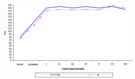 Результаты оперативного контроля, проведенного на тренировочном занятии, направленном на развитие скоростной выносливости, представлены на рис.2. Рис 2. Пульсовая характеристика тренировочного занятия спортсменов. Соответственно представленным данным управлению подлежат такие параметры тренировочной нагрузки как количество и продолжительность отдельных серий работы, интенсивность работы в серии (по данным частоты сердечных сокращений), продолжительность интервалов отдыха между сериями и частотой сердечных сокращений в конце интервалов отдыха между сериями. Обладая такими сведениями, мы получали информацию о содержании тренировочного процесса, о срочном тренировочном эффекте в результате реализации запланированной программы занятий, что, по необходимости, позволяло вносить коррекции в содержание тренировочных занятий. Текущий контроль использовался нами с целью управления тренировочными занятиями в микро и мезоциклах. Этот вид контроля использовался нами для решения следующих задач: