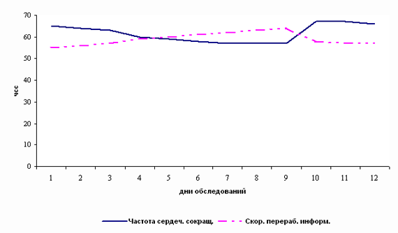 Эти сведения позволяют выбрать рациональный режим тренировок в рабочих микроциклах. Контроль за состоянием организма проводился нами ежедневно, после сна до разминки, что позволяло судить о степени восстановления организма после предыдущей тренировочной нагрузки. В качестве методик использовались показатели частоты сердечных сокращений (ЧСС) и скорости переработки информации (СПИ). Последние показатели позволяли получить сведения об аналитико и интегрирующей деятельности центральной нервной системы. Ранее нами было установлено, что первые признаки утомления в первую очередь отмечаются в функциях высших отделов мозга и несколько позже в вегетативной сфере. На рис.3 представлены данные спортсмена Р. полученные в результате проведения текущего обследования, где четко просматривается как кумулятивный эффект тренировки, так и возможность суждения о переносимости спортсменом тренировочных нагрузок в микроцикле. Такого рода сведения использовались нами как для выбора рационального режима построения тренировки в ее рабочих циклах, так и для индивидуализации тренировочного процесса.