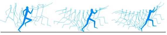 Примечание: Время отталкивания при увеличении дальности прыжка сокращается за счёт уменьшения периода опоры и снижения амортизации в коленном суставе и увеличения угловой скорости разгибания коленного сустава опорной ноги (r=0,54 - в первом отталкивании; r = 0,44 - во втором и r=0,64 - в третьем) и угловой скорости сгибания тазобедренного сустава маховой ноги (r=0,61 - в первом отталкивании; r=0,63 - во втором; r=0,62 - в третьем). Повышение угловых скоростей в суставах при отталкивании указывает на возможность в большей степени использовать эластические свойства мышц и сухожилий. Таким образом, с увеличением результата в тройном прыжке в большей степени возрастают требования к состоянию мышц нижних конечностей и их скоростно-силовым свойствам. Уровень спортивно-технического мастерства прыгуна определяется скоростью его разбега, которая является одним из ведущих элементов системы движений в тройном прыжке (r=0,56 - в первом отталкивании; r=0,45 - во втором; r=0,52 - в третьем) и, как показали наши исследования, увеличивается с ростом спортивного результата и уровня скоростно-силовой подготовленности (табл. 2 и рис. 4) [4, 7, 17]. Начальная скорость вылета обеспечивается в основном скоростью разбега и увеличивается с ростом спортивного результата (r=0,45 - в первом отталкивании; r=0,39 - во втором; r=0,38 - в третьем). Подсчёты показывают, что увеличение начальной скорости вылета в каждом отталкивании на 0,1 м· с-1 при прочих равных условиях прибавляет 30 - 35 см к общему результату [7]. Поэтому скорость, полученная спортсменом в разбеге, и характер отталкиваний определяют величину и направление усилий в тройном прыжке. Рис. 4. Изменения кинематических и динамических характеристик тройного прыжка спортсменов по мере роста спортивного результата: ______________ 1-е