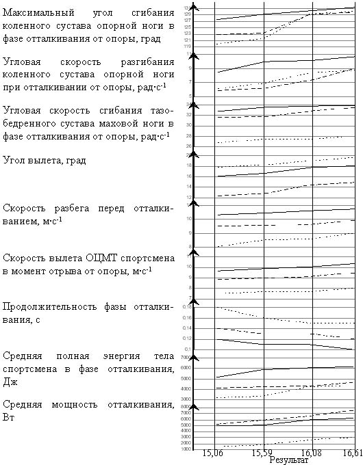 В результате корреляционного анализа были получены наиболее информативные количественные биомеханические характеристики тройного прыжка с разбега, которые отражают высокую степень взаимосвязи со спортивным результатом. Результаты исследований. В соответствии с современными литературными данными, дальность прыжка в основном зависит от трех биомеханических параметров: скорости разбега перед отталкиванием; скорости вылета ОЦМТ спортсмена в момент отрыва от опоры; угла вылета [7, 16, 17]. При этом до сих пор не были определены количественные значения биомеханических характеристик тройного прыжка с разбега, которые должны стать целевыми параметрами направленности тренировочной и соревновательной деятельности прыгунов тройным прыжком высокой квалификации. В результате корреляционного анализа были получены количественные биомеханические характеристики тройного прыжка с разбега, которые отражают высокую степень взаимосвязи со спортивным результатом (r=0,39 - 0,64 - в первом отталкивании; r=0,37 - 0,63 - во втором отталкивании и r=0,34 - 0,64 - в третьем отталкивании, что позволяет рассматривать их в качестве информативных количественных биомеханических характеристик техники тройного прыжка с разбега у мужчин (табл. 1). В результате проведенного корреляционного анализа было установлено, что для достижения высоких спортивных результатов в тройном прыжке с разбега необходимо учитывать такие важнейшие показатели: массу и длину тела спортсмена; максимальный угол сгибания коленного сустава опорной ноги в фазе отталкивания от опоры; угловую скорость разгибания коленного сустава опорной ноги в фазе отталкивания от опоры; угловую скорость сгибания тазобедренного сустава маховой ноги в фазе отталкивания от опоры; угол вылетa ОЦМТ спортсмена; скорость разбега перед отталкиванием; скорость вылета ОЦМТ спортсмена в момент отрыва от опоры; среднюю полную энергию движения тела спортсмена в фазе отталкивания; среднюю мощность отталкивания; продолжительность фазы отталкивания (табл. 1). Тройной прыжок с разбега, с точки зрения современной биомеханики, представляет собой сложную динамическую систему движений, развёртывающуюся в пространстве и во времени. Совершенствование спортивно-технического мастерства сопровождается постоянным изменением характеристик элементов системы движений, что является её самой существенной особенностью.Комплексные исследования техники тройного прыжка с разбега лучших спортсменов Украины позволили выявить определённые закономерности, происходящие в данной системе движений при увеличении спортивного результата. Таким образом, биомеханический анализ техники соревновательной деятельности позволил выявить в двигательных действиях прыгунов тройным прыжком с разбега те закономерности, которые определяют эффективность прыжков и позволяют оценивать их качество. Эти данные могут служить объективными критериями контроля специальной скоростно-силовой подготовленности прыгунов тройным прыжком с разбега высокой квалификации. Для того, чтобы проследить изменение кинематико-динамических характеристик по мере роста спортивного результата и уровня скоростно-силовой подготовленности все зарегистрированные попытки объединены в группы по уровню результативности: Проведенные нами исследования дают воз