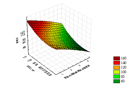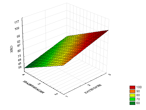 Распределение суммы квадратов общей дисперсии специальной работоспособности по факторам позволило рассчитать коэффициенты дисперсионного анализа. Они свидетельствуют о том, что изменчивость результата при бросках на 50,7 % определяется весом и квалификацией спортсмена (F=43,5; p<0,000001), на 6,1% - их взаимодействием и на 43,2 - неучтенными в данном эксперименте факторами. При этом получена относительно простая регрессионная модель этой зависимости: Y=87,68 + 0,462 х - 14,522 у ± 12,9, где Y - суммарное время выполнения 45 бросков, сек; х - вес спортсмена, кг; у - код квалификации спортсмена: 1 - МС; 2 - МСМК; 3 - ЗМС. На следующем рисунке (рис. 1) представлена более сложная графическая модель зависимости результата при тестировании спортсменов на специальную работоспособность от веса и квалификации борцов. Рис. 1. Модель зависимости суммарного времени выполнения бросков от квалификации и веса спортсменов. Данные свидетельствуют о том, что суммарное время выполнения 45 бросков за одну руку наклоном уменьшается с уменьшением массы тела и увеличением квалификации борцов, достигая минимальных значений у заслуженных мастеров спорта и мастеров спорта международного класса наилегчайшей весовой категории. Распределение эмпирических значений в пространстве объемного графика говорит о том, что зависимость близка к линейной, однако представленная на рисунке математическая модель наиболее точно описывает эту взаимосвязь следующим полиномиальным уравнением: Z = 197,8-16,9*x-2,005*y-1,07*x*x+0,036*x*y+0,015*y*y, где Z - суммарное время выполнения 45 бросков, сек; у - вес спортсмена, кг; х - квалификация спортсмена (1- КМС, 2 - МС, 3 - МСМК, 4 - ЗМС). На следующем рисунке представлена упрощенная графическая модель зависимости времени выполнения бросков от квалификации и весовой категории борцов (рис. 2). Рис. 2. Линейная модель зависимости суммарного времени выполнения бросков от квалификации и весовой категории спортсменов. Для дисперсионного анализа каждый из рассматриваемых факторов кодировался по трем градациям. В данном анализе из фактора "квалификация" были исключены экспериментальные результаты кандидатов в мастера спорта, которые в предыдущих расчетах кодировались под №1. Код 2 использовался для обозначения МС, 3- МСМК, 4 - ЗМС. Фактор "весовая категория" дифференцировался следующим образом: 1 группа - 55-60 кг; 2 гр. - 66-74 кг; 3-я группа - св. 84 кг). Данная модель в целом подтверждает общую закономерность зависимости показателя специальной работоспособности и скоростных возможностей от массы и квалификации спортсмена. В тоже время, она ее более наглядно демонстрирует и уточняет, показывая, что скоростные возможности и уровень специальной работоспособности борцов достигают наилучших значений в условиях совместного влияния двух факторов. Это также подводит научное обоснование под необходимость дифференцированного подхода при разработке критериев, нормативных оценочных шкал, модельных характеристик, моделирования и прогнозирования. При этом получена еще одна, относительно простая математическая модель зависимости суммарного времени выполнения бросков от квалификации и весовой категории: Y=101,24 + 9,855 · x-13,431 · y ± 12,6, где Y - суммарное время выполнения 45 бросков, сек; х - код квалификации спортсмена: 1 - МС; 2 - МСМК; 3 - ЗМС; у - код весовой категории спортсмена, кг. В таблице 2 представлены среднегруппо