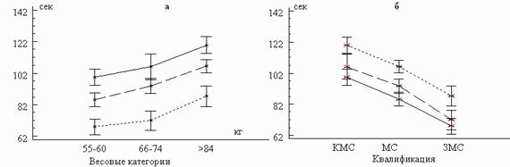 Графическое представление зависимости времени выполнения 45 бросков в тесте на специальную работоспособность от различных сочетаний квалификации и весовой категории представлено на рис. 3. Рис. 3. Зависимость времени выполнения бросков в тесте на специальную работоспособность от различных соотношений квалификации и весовой категории борцов. а: _______ - КМС; _ _ _ _ _ - MC; - - - - - - MCМК, ЗМС б: _______ - 55-60 кг; _ _ _ _ _ - 66-74 кг; - - - - - - > 84 кг Полученные различия свидетельствуют о необходимости разработки модельных характеристик специальной работоспособности борцов дифференцированно не только в каждой из выделенных весовых групп спортсменов, но также и для борцов разной квалификации, как отдельно, так и в различных сочетаниях с весовыми группами: легкие, средние, тяжелые - КМС, МС, ЗМС и МСМК. Проделанный анализ и представленные модели явились основой для разработки оценочных критериев и прогнозирования уровня специальной работоспособности в зависимости от выявленных статистически значимых детерминант (табл. 3). ≤ Таблица 3 Оценочные шкалы специальной подготовленности борцов по суммарному времени, затраченному на выполнение 3-х серий бросков по 15 в каждой серии (сек).