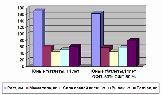 Анализ показывает, что рост спортсменов имеет тенденцию увеличения с повышением групп весовых категорий на 7,4 % (при p<0,05), (у сборников Украины- 12,1 %, p<0,05). В 1- й и 2- й группах рост выше, а в 3- й- меньше. Анализ свидетельствует, что только у спортсменов 1- й группы получены достоверные отличия между молодыми тяжелоатлетами и сборниками Украины (t=2,5). В других группах разница роста недостоверна. Другой критерий- пропорции тела молодых и взрослых спортсменов- характеризует уровень физического развития и предоставляет сравнить его с физическим развитием молодых сборников Украины. Показатель отношения окружности талии к окружности грудной клетки больший у спортсменов сборной команды Украины во всех группах весовых категорий, но достоверных отличий не выявлено. Показатель окружности плеча к окружности грудной клетки в 1- й группе одинаков, а во 2- й и 3- й больше у сборников Украины. Только во 2- й группе получена статистическая достоверность (p<0,05). Показатель окружности бедра к окружности грудной клетки во 2- й и 3- й группах больше у сборников Украины, а в 1- й- меньше. Достоверных отличий не получено. Показатель окружности икроножной мышцы к окружности бедра в 1- й и 3- й группах больший у сборников Украины, но не достоверен, а во 2- й- меньший. Во второй группе получена статистическая достоверность (p<0,05). Показатель Эрисмана имеет свои особенности: в 1- й и 2- й группах больший у сборников Украины, но не достоверен, а в 3- й- меньше. Отличия показателей в 3- й группе статистически достоверно (t=3,9). Отмечается также увеличение этого показателя у атлетов 2- й и 3- й групп, сравнено с 1- й (p<0,05). Показатель крепости телосложения в 1- й и 2- й группах меньше у сборников Украины, но достоверен лишь во 2- й группе (p<0,05). В 3- й группе- выше, но разница отличий статистически не достоверна. Показатель динамометрии кисти имеет тенденцию увеличения с возрастанием весовых категорий. Отличия показателей во 2- й и 3- й в сравнении с 1- й имеет статистическую достоверность (p<0,05). Относительная величина мышечной силы кисти является объективным показателем, так как рост силы в процессе тренировки во многом связан с увеличением массы тела [10]. Для всех трех групп весовых категорий величина мышечной силы кисти имеет высокий показатель. Приведены показатели физического развития младших юношей (13- 15 лет) (рис. 1). Анализ показывает, что рост с повышением весовых категорий также имеет тенденцию к увеличению на 12,8 %. В весовой категории до 45 кг- 156,6+ 2,6; 50- 164,7+ 2,6 (p< 0,05); 56- 167,0+ 3,9; 62- 170,6+ 1,8; 69- 173,0+ 0,6; 77- 174,0+ 2,5; 85- 176,5+ 1,0 (см). В остальных весовых категориях достоверных отличий не выявлено. Масса тела соответственно: 43,3+ 1,3; 47,8+ 0,1; 54,5+ 0,6; 60,1+ 0,4; 65,9+ 0,2; 73,0+ 0,8; 79,9+ 0,6 (кг). Отличия показателей статистически достоверны (p< 0,05). Окружность грудной клетки: 77,6+ 1,1; 78,7+ 0,7; 85,7+ 0,9 (p< 0,05); 88,1+ 0,5 (p< 0,05); 91,5+ 0,2 (p< 0,05); 92,5+ 0,9; 98,0+ 0,7 (p< 0,05) (см). Динамометрия правой кисти: 29,5+ 1,2; 35,6+ 2,2; 42,5+ 0,8; 45,0+ 0,7; 56,0+ 0,6; 58,5+ 1,0; 65,0+ 3,6 (кг). Разница показателей статистически достоверна (p< 0,05) во всех категориях, кроме 85 кг. Средний результат в рывке: 38,6+ 2,6; 41,0+ 1,0; 51,6+ 0,1; 59,0+ 0,2; 66,0+ 3,5; 70,0+ 0,6; 81,5+ 2,3 (кг). Достоверность различий (p< 0,05) присутствует во всех категориях, кроме 77 кг. Средний результат в толчке: 50,0+ 1,8; 50,0+ 1,0; 61,0+ 0,7; 71,5+ 0,7; 79,0+ 3,1; 92,5+ 3,8; 103,0+ 2,4 (кг). Разница результатов статистически достоверна (p< 0,05) во всех весовых категориях, кроме 50 кг. Приведено сравнение показателей физиче