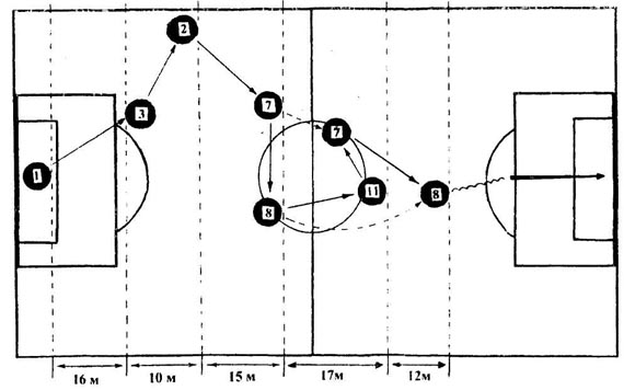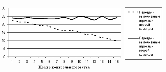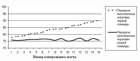 ![]() Диаграмма 1. Поэтапные изменения процентного соотношения передач выполненных верхом по воздуху, игроками первой и второй команд, в течение 15 контрольных матчей. Диаграмма 2. Поэтапные изменения процентного соотношения передач выполненных низом по земле, игроками первой и второй команд, в течение 15 контрольных матчей. Следует отметить тот факт, что в первой команде количество передач выполненных низом от матча к матчу возрастало, а количество передач выполненных верхом наоборот уменьшалось. Такого результата удалось добиться не только благодаря применению нового метода тренировок, но и особым тренерским установкам, которых придерживались игроки первой команды во время всех 15 контрольных матчей. Расстояние от своих ворот до ворот соперника им было разрешено преодолевать преимущественно за счёт применения коротких передач, выполненных низом по земле, при этом активно используя линию полузащиты, в особенности центральных полузащитников, например, как показано ниже на рис.1. Пунктирные линии поперёк поля, отмеряют расстояние, пройденное после выполнения очередной передачи. Рис. 1. Схема выполнения эксперимента Условные обозначения ~~~~~~~~~ движение с мячом; - - - - - - - - - движение без мяча; удар по воротам; 2,3 - игроки линии обороны; ![]() ¦ ¦ - расстояние, пройденное после выполненной передачи. Выводы. Таким образом, в течение пятнадцати контрольных матчей, игрокам первой команды удалось понизить количество выполненных передач верхом на 12,39%, а количество выполненных передач низом повысить на 12,61%. Во второй команде, на протяжении всех пятнадцати матчей, не удалось отметить какой-либо чёткой закономерности в увеличении или уменьшении передач выполненных низом по земле или верхом по воздуху. Подбирая упражнения, для проведения очередного тренировочного занятия, тренер должен руководствоваться Суворовским правилом: "Тяжело в учении - легко в бою". На тренировочном занятии игрокам должно быть в несколько раз тяжелее умственно и физически. Такие условия необходимо создавать с одной только целью - чтобы у игроков образовался некий запас физических и умственных сил на игру с предстоящим соперником. Ведь ещё не известно как сложится игра, и может быть, именно эти резервы в конечном итоге помогут команде одержать победу над соперником. Перспективными являются исследования, направленные на поиски закономерностей, которые можно выявить во время применения игроками командных тактико-технических действий. Литература.