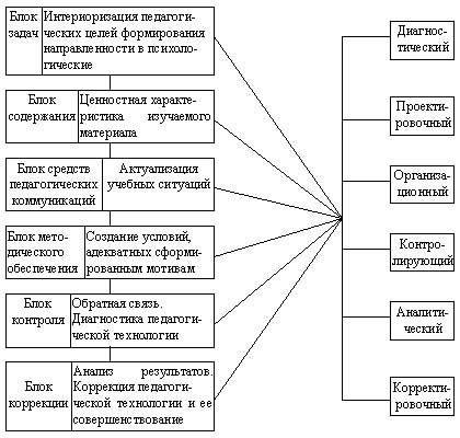 В соответствии с функциональной схемой управления выделяются этапы: диагностический, проектировочный, организационный, контролирующий, аналитический, корректировочный. Каждый этап состоит из инвариантных видов деятельности преподавателя, называемых в дальнейшем блоками. Это блоки задач, содержания, средств педагогической коммуникации, методического обеспечения, контроля и коррекции. Выделение блоков контроля и коррекции обусловлено их важностью не только в целостном управленческом цикле (технологии управления формированием направленности личности студента на занятия физической культурой), но и их значимости в реализации каждого технологического этапа. Каждый из указанных блоков проектирования педагогической технологии имеет свою логику и особенности. Вместе с тем они тесно связаны друг с другом, взаимно переплетаются и дополняются. Происходит совершенствование каждого из блоков, и вся стратегия проектирования педагогической технологии приобретает свое внутреннее единство в разноструктурности воспроизводящей и творческой деятельности преподавателя. Чтобы преподавать убедительно и суметь достичь гарантированного результата, преподавателю необходимо овладеть основами проектирования педагогических технологий по формированию планируемого уровня направленности личности студентов. Для этого необходимо:
