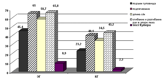 Одним из важных момент управления занятием оздоровительной направленности является установление соотношения между предлагаемой нагрузкой и функциональным состоянием. Эффективность воздействия на организм возрастает, в том случае если ее методика индивидуализирована. Для оценки функционального состояния и выраженности нервной системы нами был проведен анализ результатов исследования по показателям теппинг-теста, величины латентного периода простой двигательной реакции на световой сигнал и общего времени двигательной реакции, а также ряд показателей связанных с зрительно-моторной реакции на односторонне движущийся объект. Результаты исследования показали, что у ветеранов-баскетболистов контрольной группы по сравнению с экспериментальной группой происходит повышение силы торможения и снижение силы возбудимости нервных клеток, происходит понижение концентрации внимания и наблюдается долее длительный по сравнению с нормой латентный период простых двигательных и дифференцированных реакций. Внешне это проявляется за счет снижения показателей функционального состояния и более низким уровнем работоспособности. При изучении определения лабильности и силы нервных процессов нами использовался тест критическая частота световых мельканий. Следует отметить, что лица, имеющие высокий уровень спортивного мастерства (МС, МСМК) имеют более высокие пороги чувствительности зрительного анализатора и исходя из этого более высокую силу нервных процессов. У ветеранов имеющий уровень КМС наблюдается снижение чувствительности и силы нервных процессов. В ходе исследования выявлено что, под воздействием занятий баскетболом повышается уровень физического развития. Наиболее достоверные различия произошли в следующих показателях: -увеличилась экскурсии грудной клетки; -повысилась жизненная емкость легких; - нормализовалось артериальное давление, - увеличились показатели кистевой динамометрии и становой силы. Оценка физического развития составляет выше среднего уровня у 100 % обследуемого контингента (по отношению к исходным показателям: средний уровень -43 % и выше среднего- 57 %) Отмеченные изменения в ряде систем организма свидетельствуют об улучшении функций дыхательной и сердечно-сосудистой систем, расширении их функциональных возможностей у занимающегося контингента. Следует отметить и тот факт, что под воздействием занятий оздоровительной направленности у ветеранов спорта произошли изменения в показателях характеризующих двигательную подготовленность. На рисунке представлены относительные показатели двигательной подготовленности исследуемого контингента. На основании полученных результатов можно отметить, что у ветеранов спорта экспериментальной группы показатели двигательной подготовленности превышают показатели контрольной группы. Межгрупповые различия достоверны по всем признакам, подтверждением служит процентное соотношение в выполнении показателей. Рис. 1. Показатели двигательной подготовленности ветеранов спорта,% Так, результаты исследования свидетельствуют об улучшении показателей характеризующих проявление: - силы: мышц брюшного пресса на 55,2 % от исходного уровня; мышц спины (45,4 %); мышц ног (58,7 %) и сила рук (65,8 %); - скоростной выносливости (52,4 %); -общей выносливости (8,9 %) . Выводы. 1.Провед