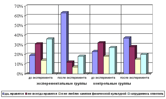 При проектировании подобных современных систем следует учитывать: 1. Такие системы представляют собой системы, объединяющие возможности компьютера с компетенцией и опытом эксперта в определенной области знаний, т.е. они должны относится к экспертным системам. 2. Учитывая, что обработка знаний в обучающей системе человек - ЭВМ наиболее эффективна при использовании модельных структур, чрезвычайно актуальной становится необходимость привлечения специальных методов моделирования, принятых в объектно-ориентированном анализе. 3. Компьютерные обучающие системы должны обладать свойством расширяющихся интеллектуальных систем, обеспечивающих необходимую градацию уровня обучения и знаний в зависимости от процесса усвоения учебного материала пользователем. 4. В режиме контроля и тестирования система должна располагать средствами объяснения (желательно на естественном языке), обеспечивающими обучаемого рационально-обоснованными доводами при оценке его знаний и выдаче рекомендаций по дальнейшему изучению предмета [6]. Применяя информационные технологии, необходимо обращать внимание на возможности их комплексного использования, т.е. на составление, нахождение или создание тематических комплексов. В Межвузовском центре по физической культуре был разработан ряд информационных тематических комплексов - "Гибкость", "Атлетическая подготовка", "Аэробика, шейпинг...", компьютерные программы "Атлет", "Фитнес", "Грация" и др. [3] Богданов В.М., Понамарьов В.С., Соловов А.В. подготовили к изданию учебный комплекс "Сделай себя сам", который интегрирует учебный материал следующих комплексов: "Основы физического воспитания", "Контроль и самоконтроль физического развития", "Оздоровительный бег" и "Атлетическая гимнастика" и представляет собой учебное пособие и CD-ROM с электронными учебниками. При изучении вопроса внедрения информационных технологий в отрасли физического воспитания специалистами было разработано множество комплексов для учебного процесса Вузов и школ, но при этом необходимо отметить, что абсолютно упущен из внимания учебный процесс в средних профессионально-образовательных учреждениях. Исследования Б.Г. Акчурина, 1996; Т.Г. Коваленко, 1999; Г.Л. Любимовой, 1999 и др. свидетельствуют о наличии закономерной тенденции к снижению состояния здоровья у учащейся молодежи. Одной из основных причин такого положения является недостаточная двигательная активность учащихся (П.В. Зайцев, 1991; Д.Н. Давиленко, 1996) [7]. При изучении вопроса использования информационных технологий физического воспитания учащихся средних профессионально-технических учреждений, были выявлены лишь одна научная работа Немовой О.А. "Повышение эффективности физического воспитания студентов средних профессиональных образовательных учреждений с использованием информационных технологий". Результаты исследований, отображенные на рис. 2, подтверждают их позитивное влияние на учащихся занимающихся физической культурой. Рис. 2 Отношение учащихся экспериментальных и контрольных групп к занятиям физической культурой до и после эксперимента (в %) (Немова О.А., 2006) Широкие возможности информационных технологий позволяют повысить уровень знаний учащихся в различных сферах деятельности и физическое воспитание не исключение. Путем разработок всевозможных теоретических и пр