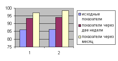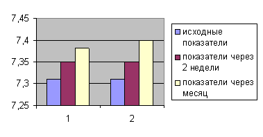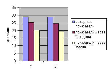 1- контрольная группа; 2 - экспериментальная группа Рис.1 Восстановление РН крови под влиянием физической реабилитации. 1- контрольная группа; 2 - экспериментальная группа Рис.2 Восстановление SPO2 под влиянием физической реабилитации. 1- контрольная группа; 2 - экспериментальная группа Рис.3 Восстановление ЧДД под влиянием физической реабилитации. Выводы. Результаты, полученные при проведении исследования, позволили сформулировать следующие выводы: